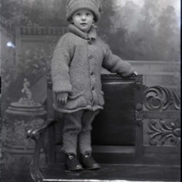 Unidentified young child wearing a wintry outfit and hat, is standing on a bench.