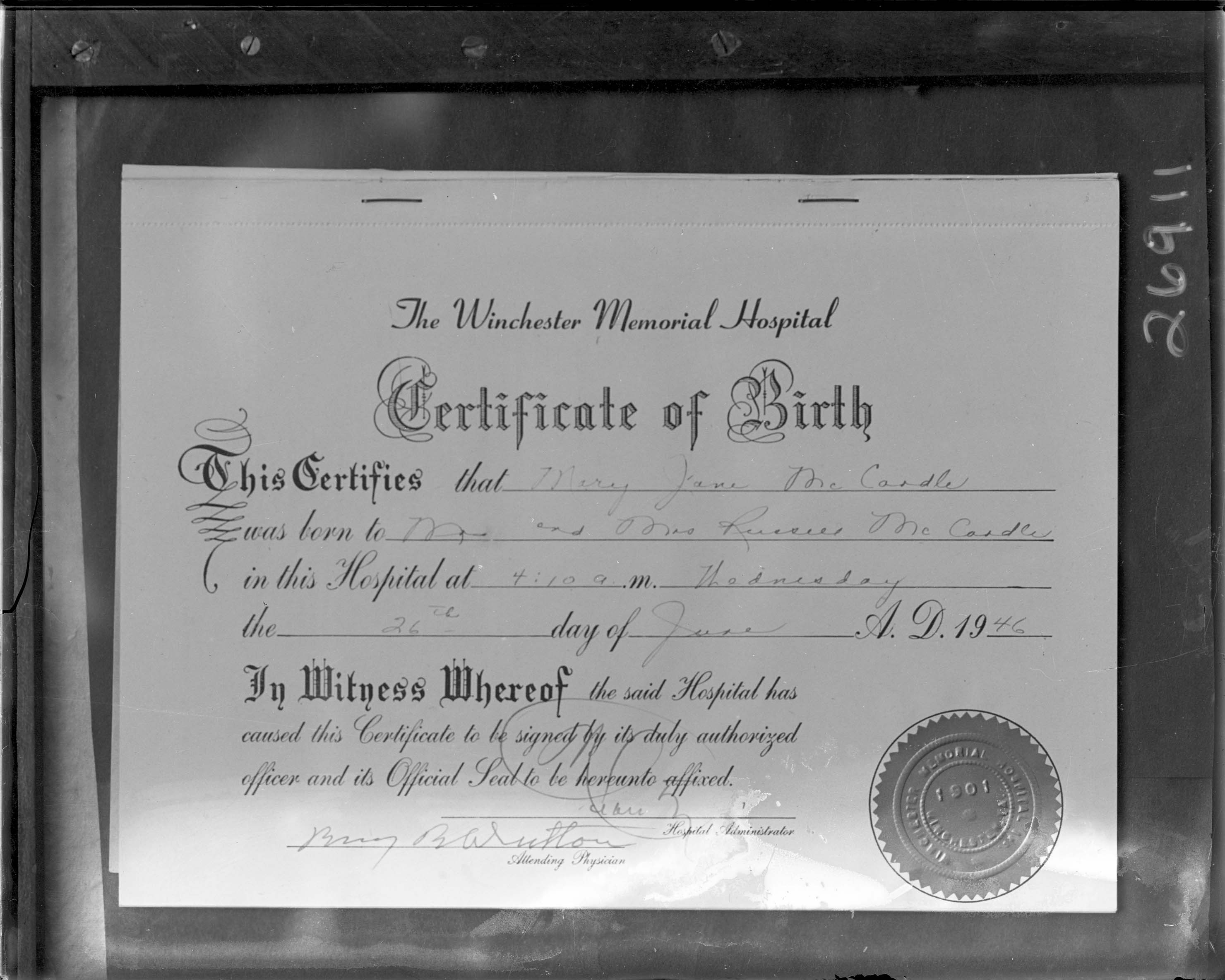 Photograph of the hospital birth registration issued for Mary Jane McCardle who was born on June 26, 1946, in Winchester Memorial Hospital, Frederick County, Virginia.