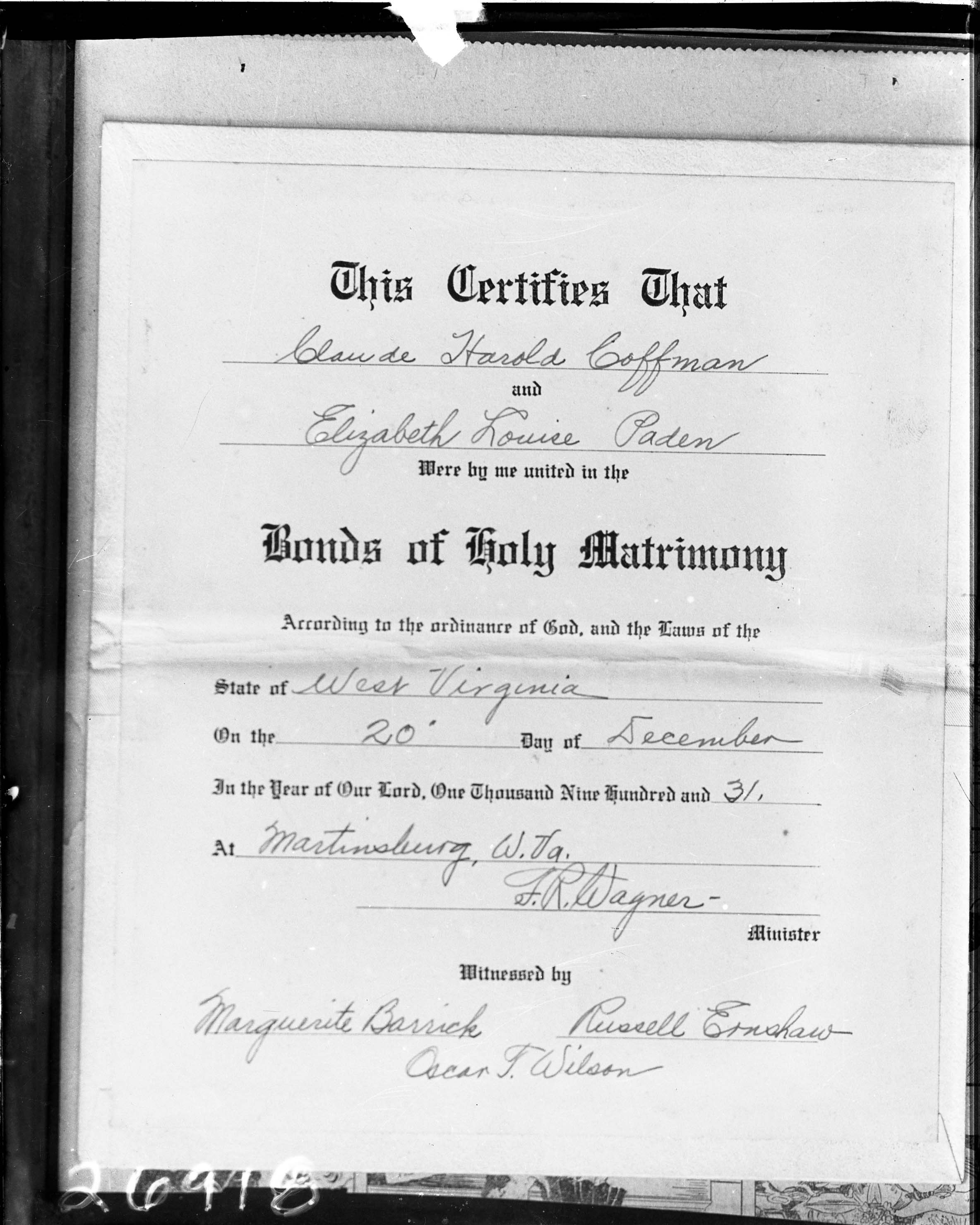 Marriage certificate attesting that Claude Harold Coffman and Elizabeth Louse Paden were married in Martinsburg, West Virginia, on December 20, 1931.
