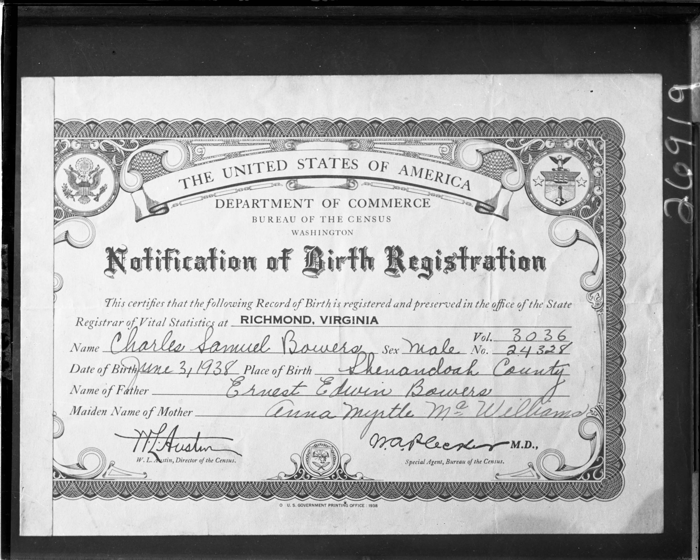 Photograph of the birth registration issued for Charles Samuel Bowers who was born on June 3, 1938, in Shenandoah County.