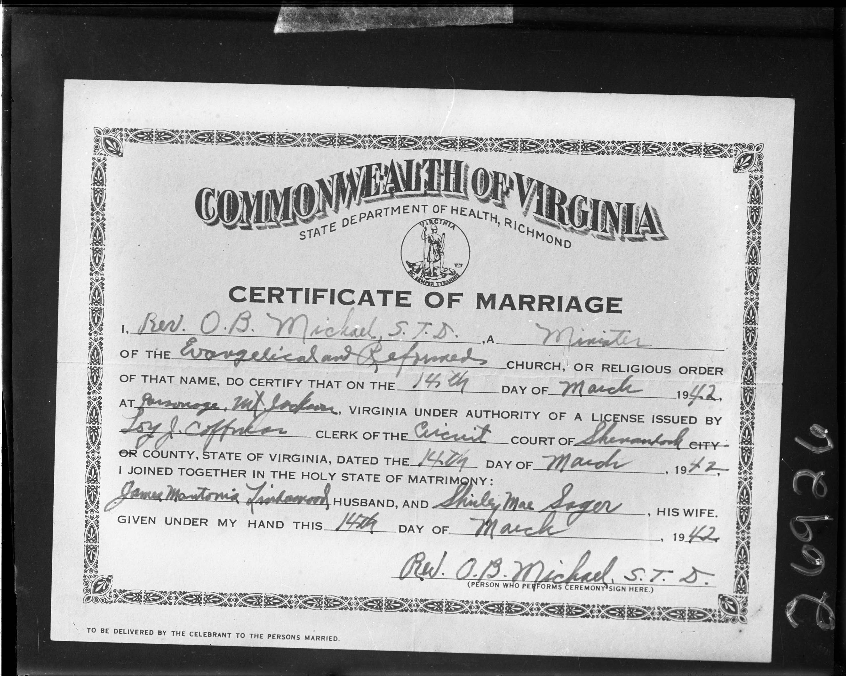 Marriage certificate attesting that James Mantonia Lindamood and Shirley Mae Sager were married in Mt. Jackson, Virginia, on March 14, 1942.