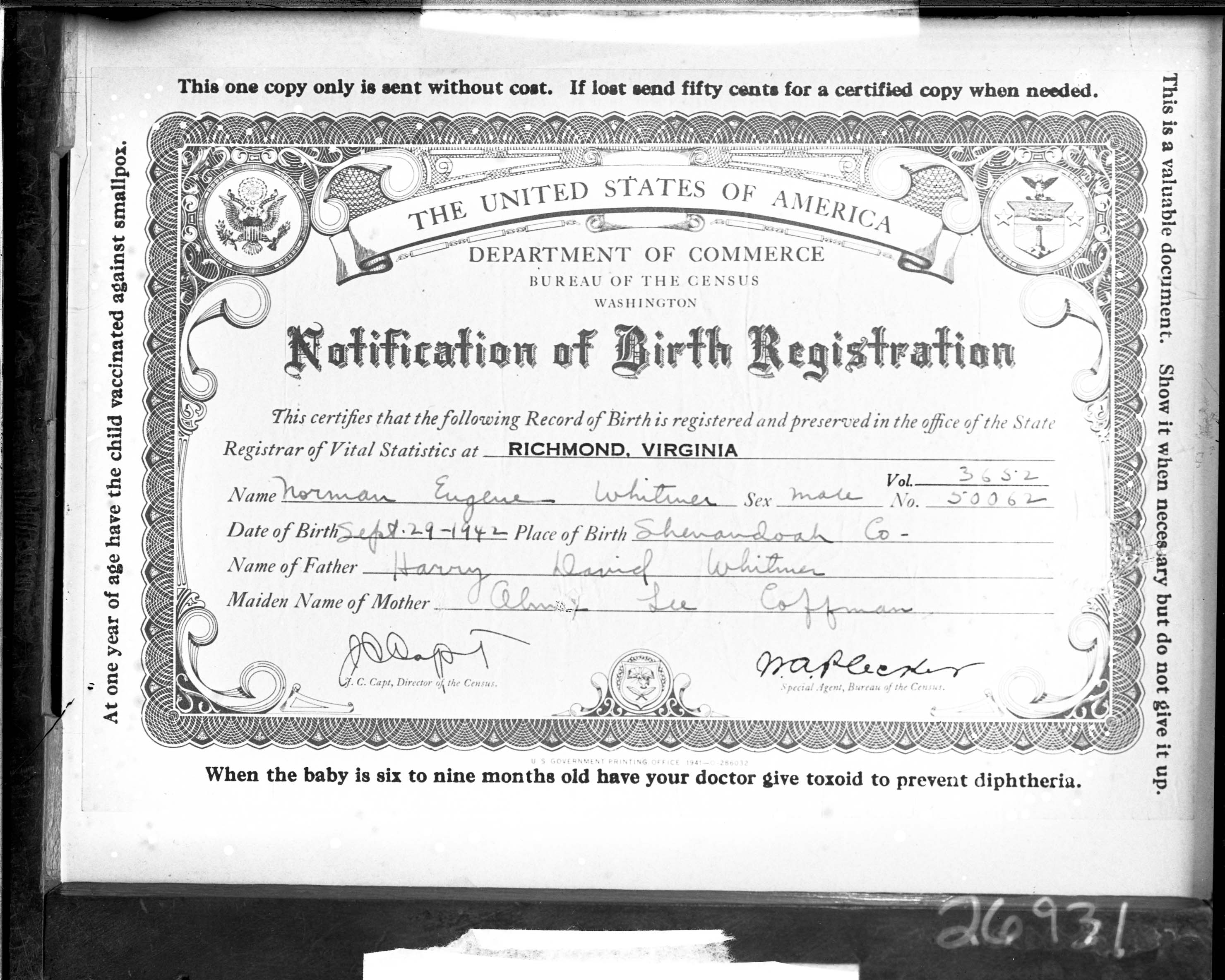 Photograph of the birth registration issued for Norman Eugene Whitmer who was born on September 29, 1942, in Shenandoah County.