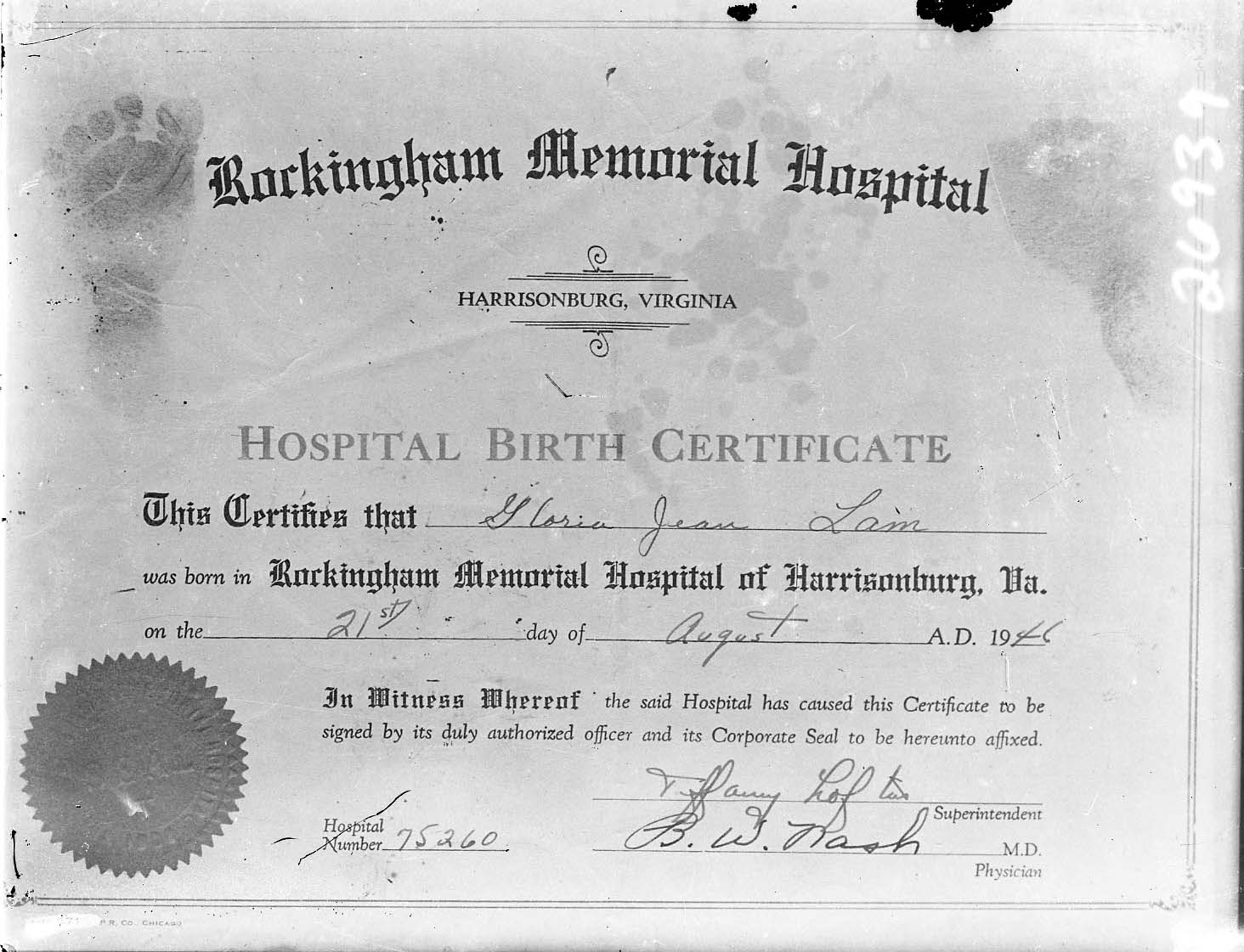 Photograph of the hospital birth registration issued for Gloria Jean Lam who was born on August 21, 1946, in Rockingham Memorial Hospital in Harrisonburg, Virginia.
