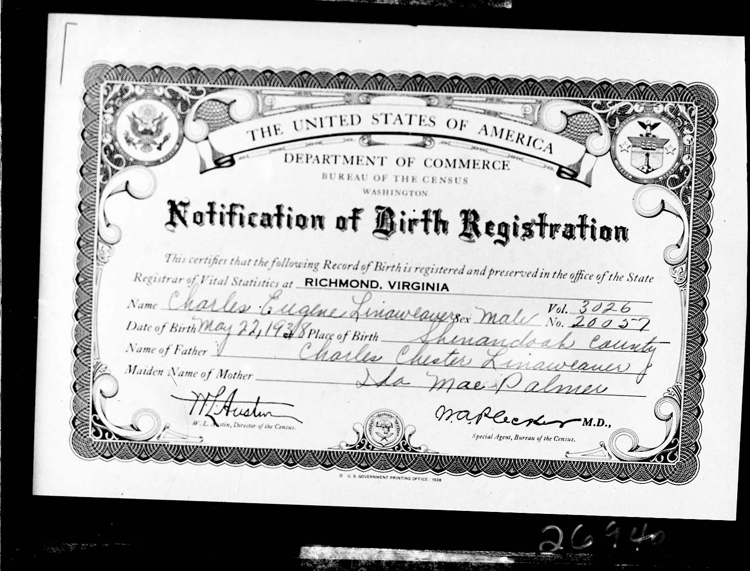 Photograph of the birth registration issued for Charles Eugene Linaweaver who was born on May 22, 1938, in Shenandoah County.