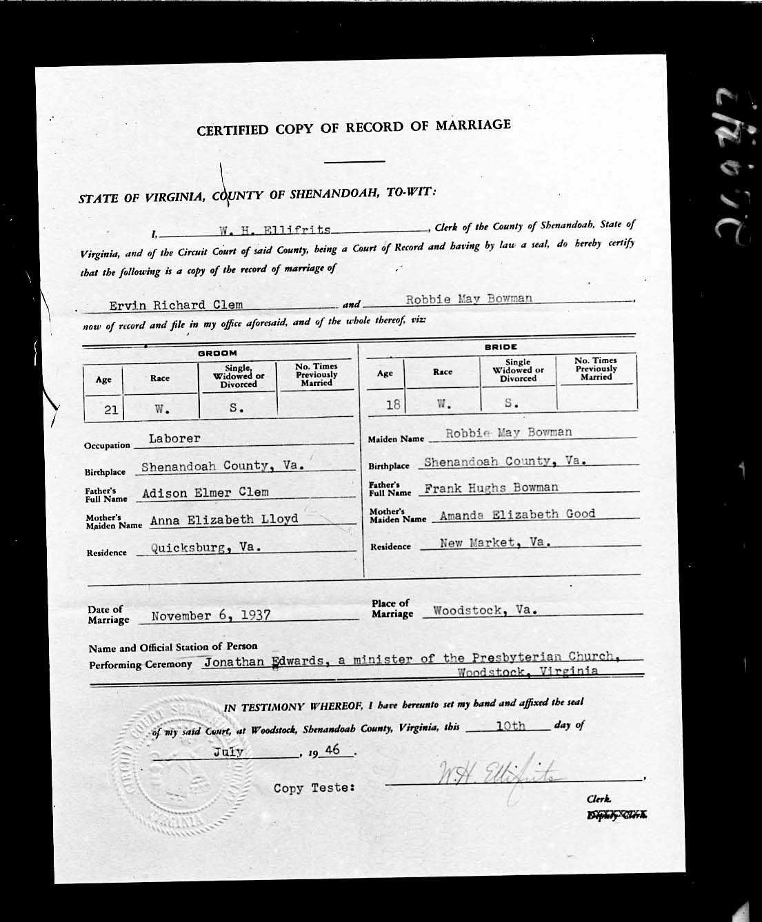 Photograph of a certified copy of a marriage record dated 10 July 1946, and attesting that Ervin Richard Clem, 21 years old, and Robbie May Bowman, 18 years old, were married in Woodstock, Virginia, on November 6, 1937.