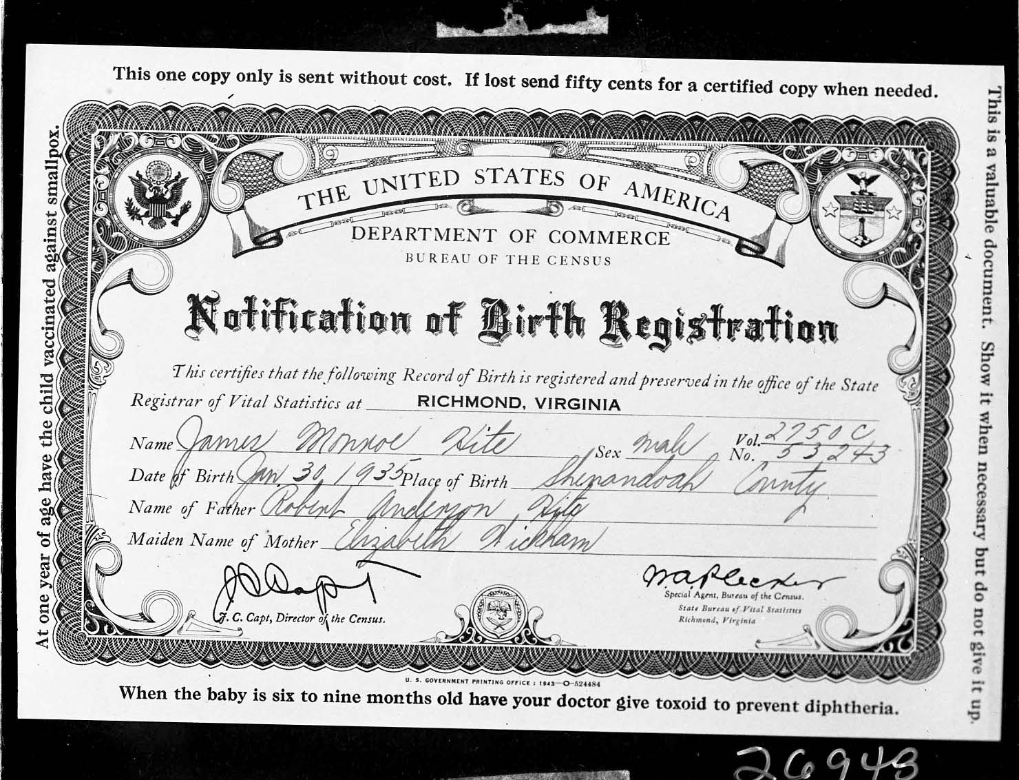 Photograph of the birth registration issued for James Monroe Hite who was born on January 30, 1935, in Shenandoah County.