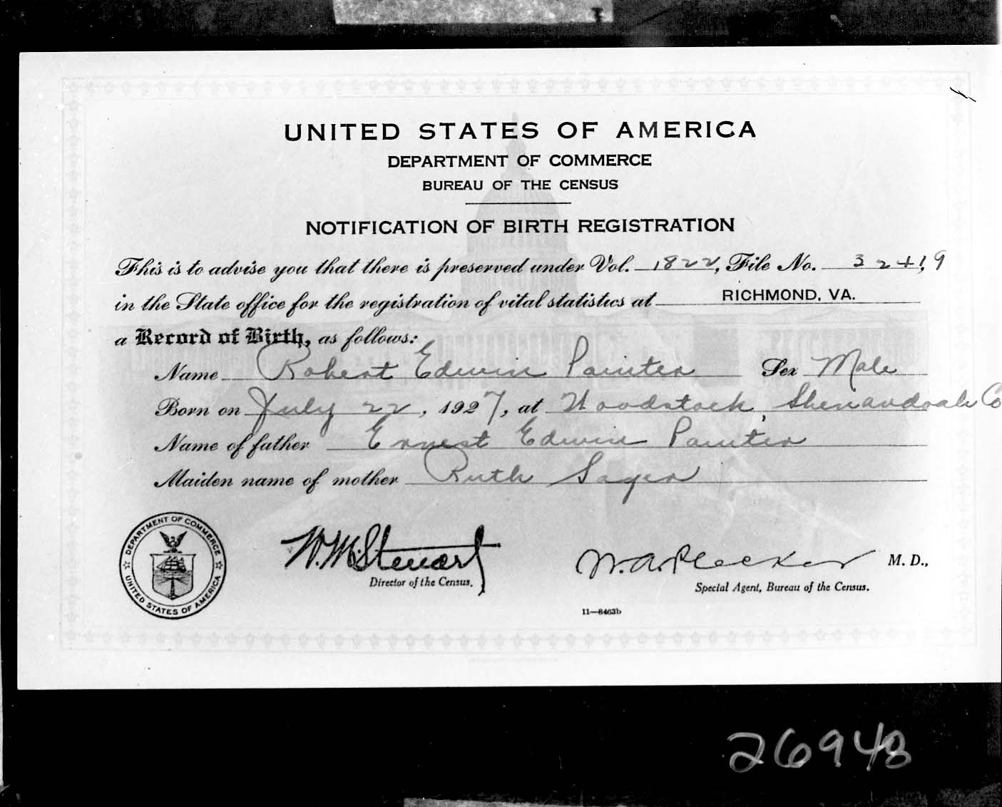 Photograph of the notification of birth registration issued for Robert Edwin Painter who was born on July 22, 1927, in Woodstock, Shenandoah County.