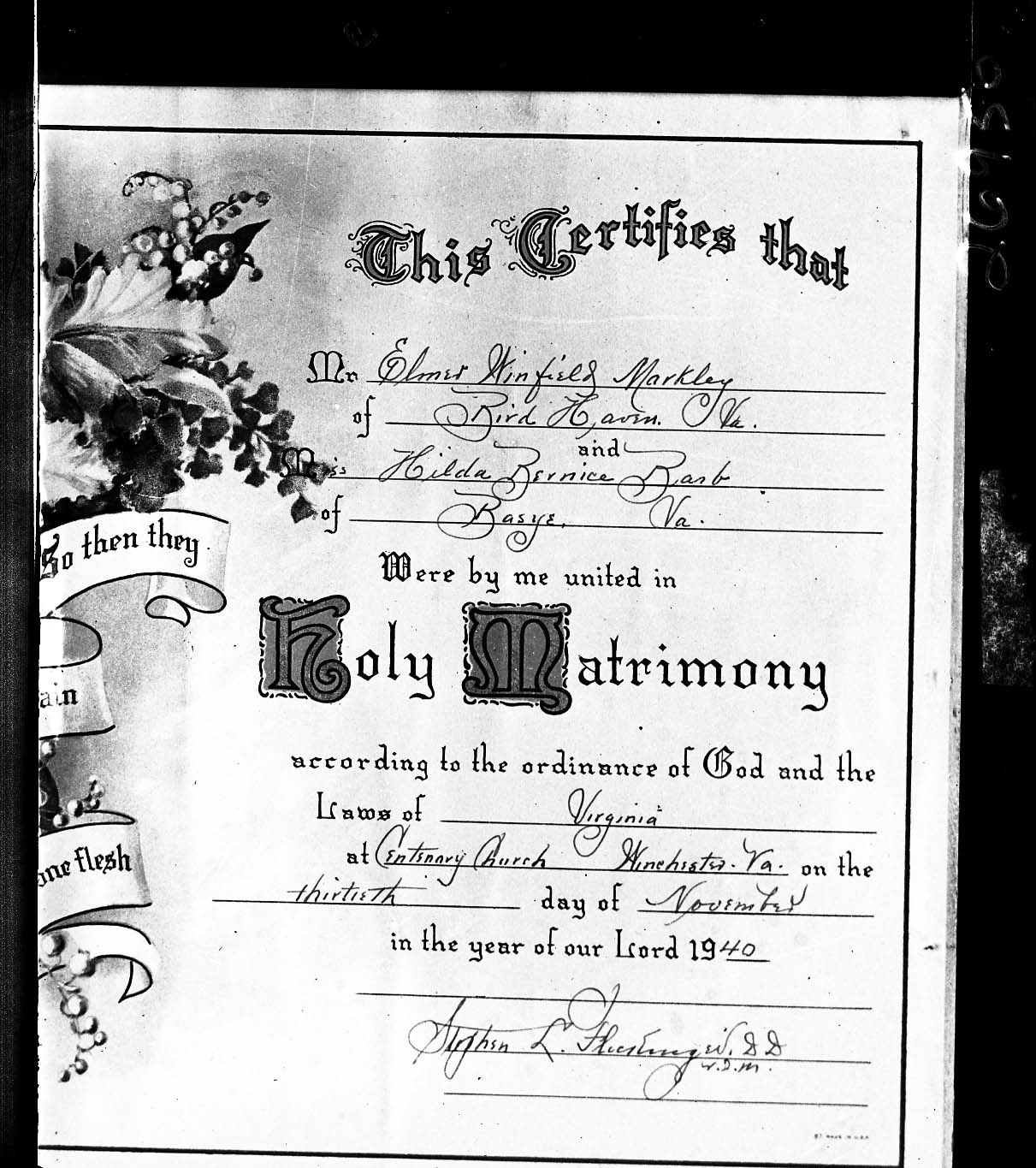 Photograph of a Marriage certificate attesting that Elmer Winfield Markley of Bird Haven and Hilda Bernice Barb of Basye, were married in Winchester, Virginia, on November 30, 1940.