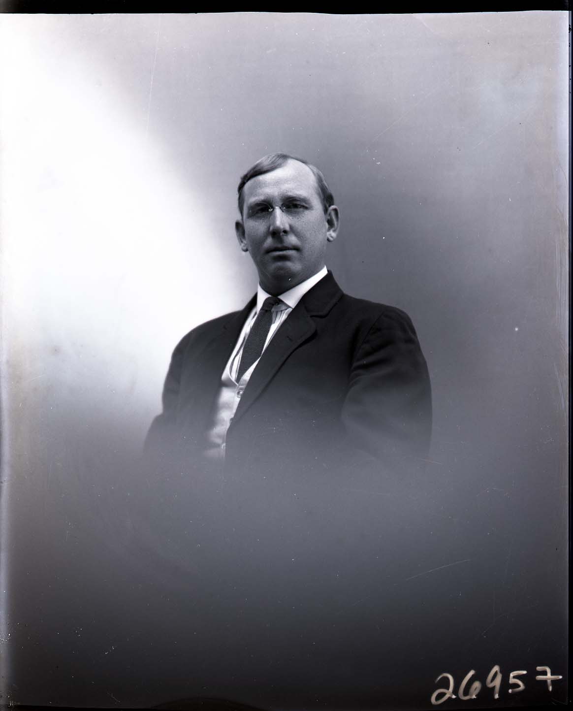 Portrait photograph of an unidentified man in pince-nez glasses, wearing a suit and tie.