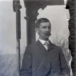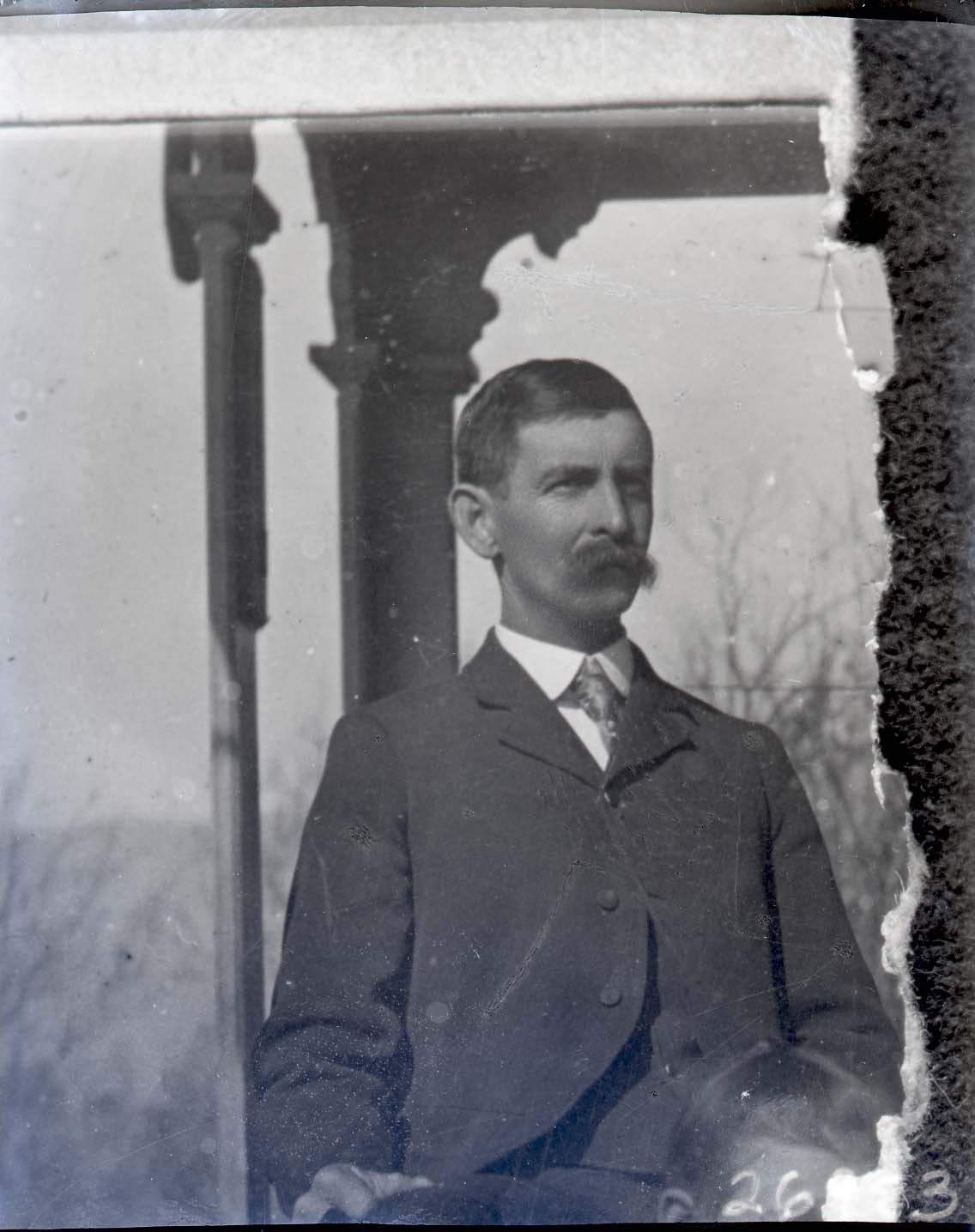 Photo of a torn photograph of an unidentified man with a mustache and wearing a suit and tie, who is standing outdoors.