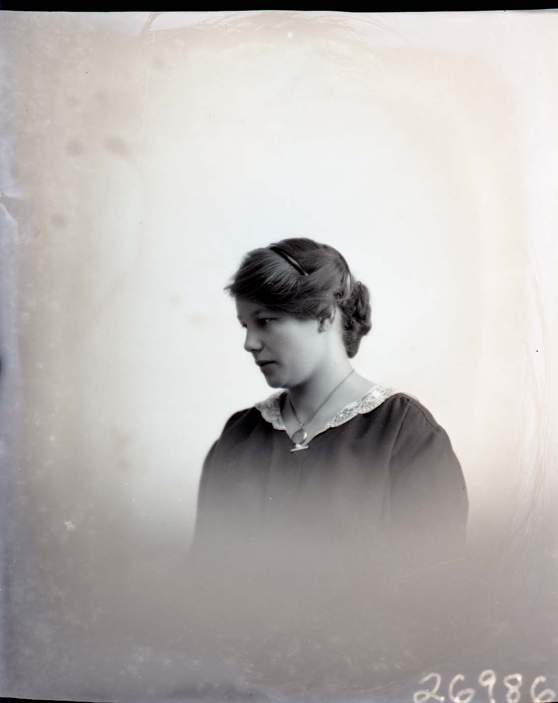 Portrait photograph of an unidentified woman wearing a locket and shown looking downwards, almost in profile.
