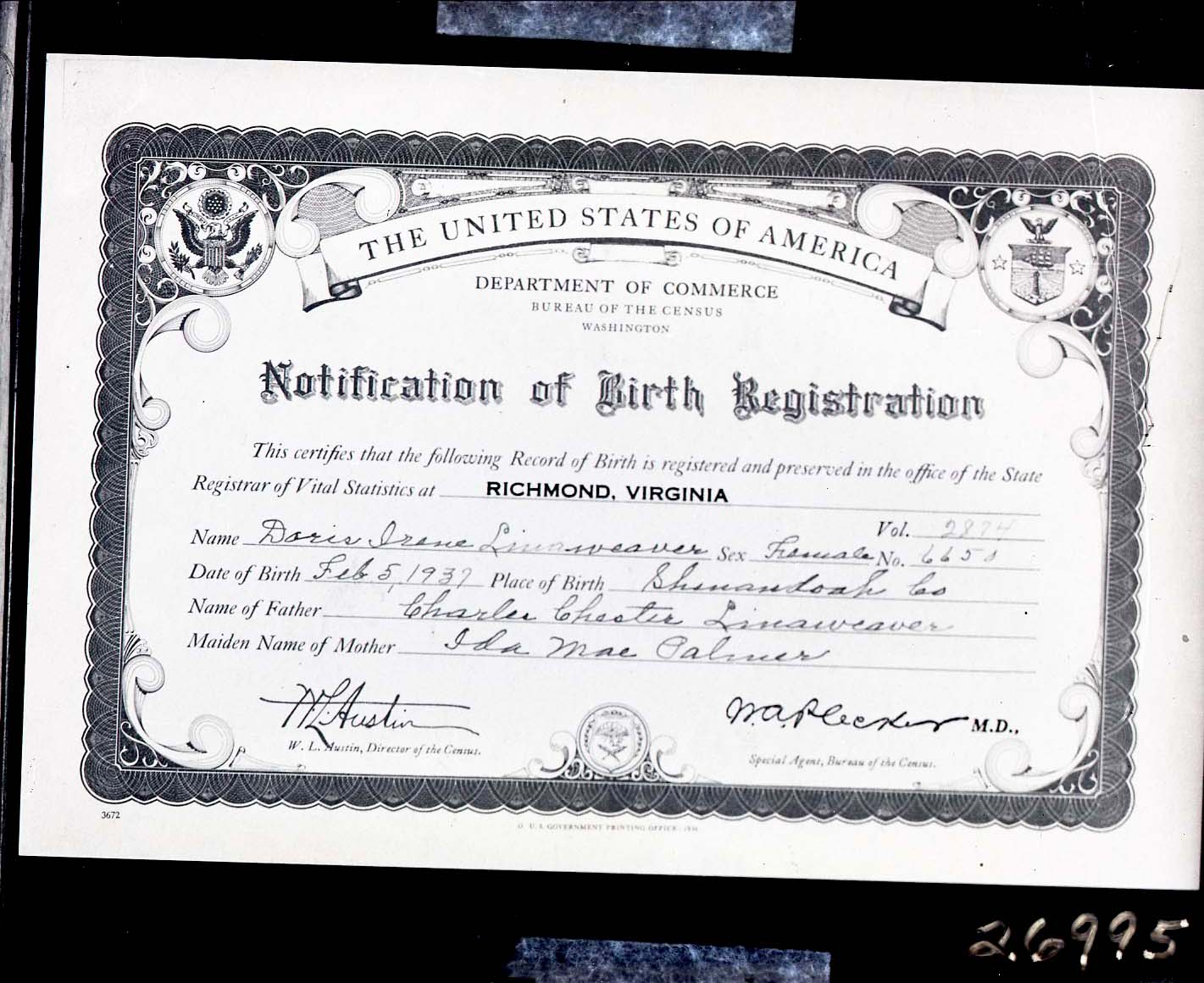 Photograph of the birth registration issued for Doris Irene Linaweaver who was born on February 5, 1937, in Shenandoah County.