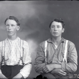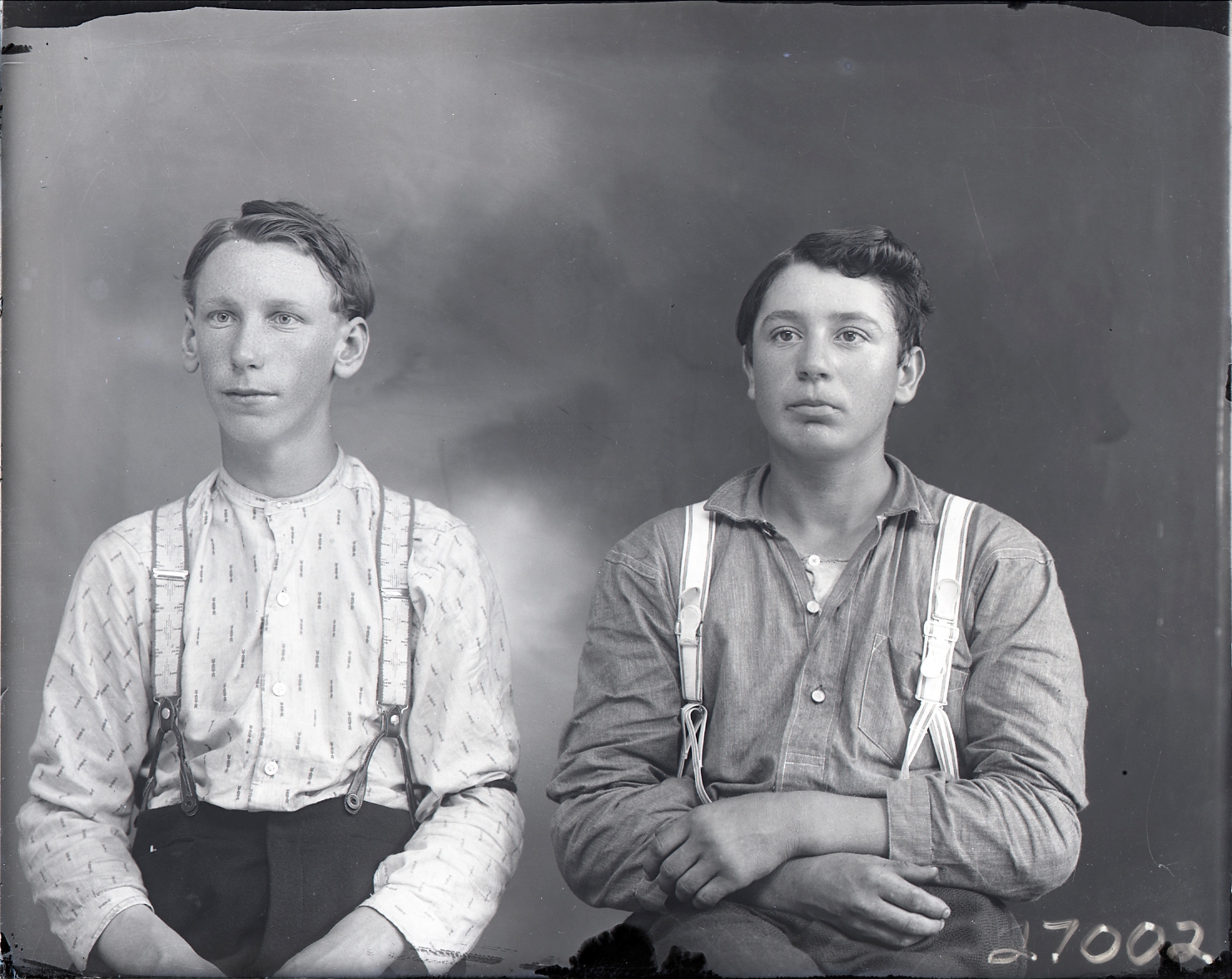 Portrait photograph of two unidentified young men, possibly teen-aged, both wearing suspenders and work shirts.
