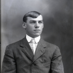 Portrait photograph of an unidentified young man wearing a suit and tie with a starched collar.