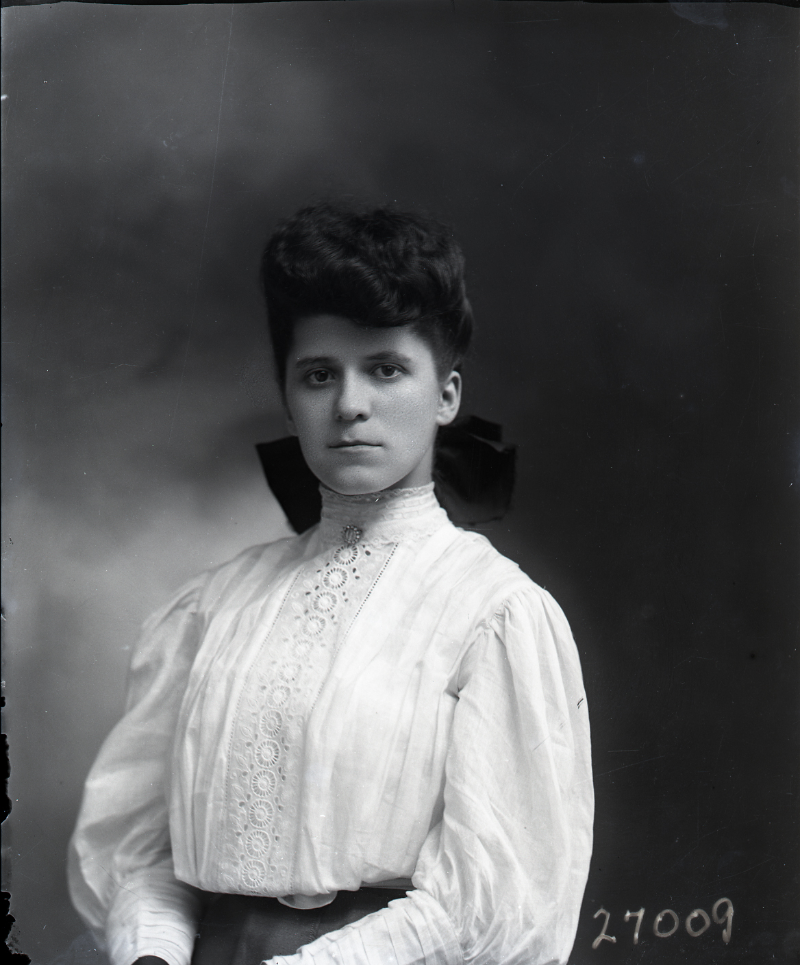 Unidentified woman with a large bow in her styled hair has a pin on the collar of her blouse.