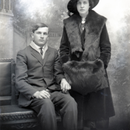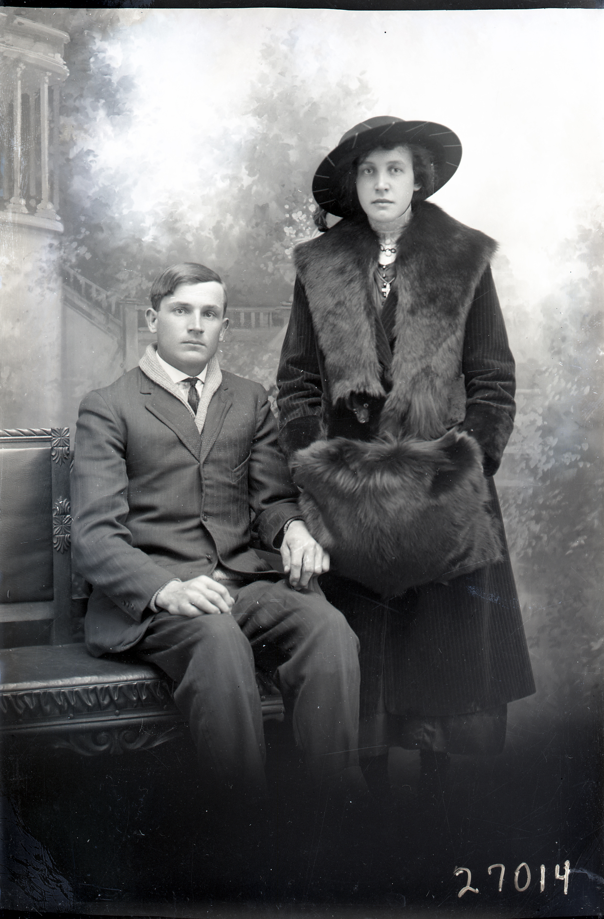 Unidentified young man, seated, with an unidentified woman in a wide-brimmed hat, fur stole and hand muff standing beside him.