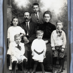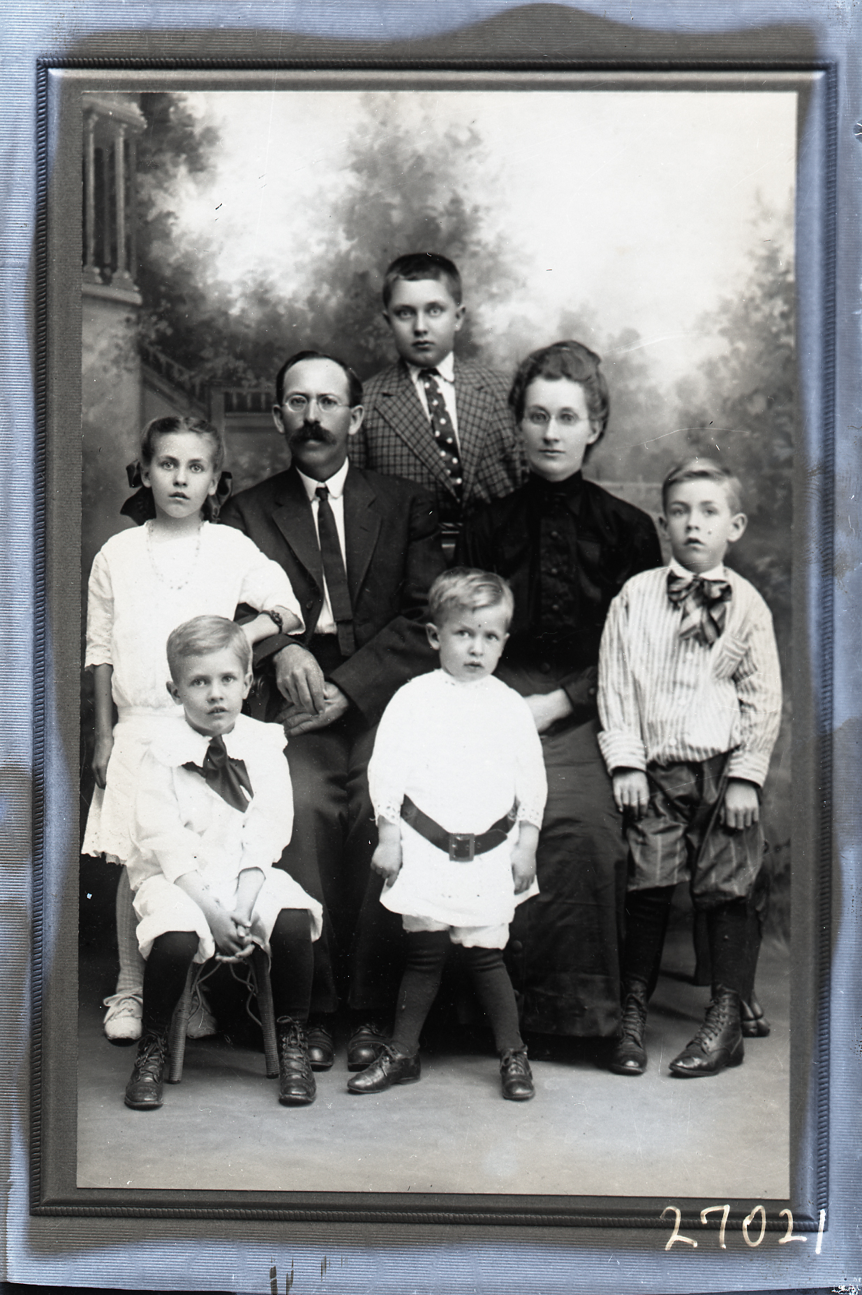 Unidentified man with glasses and a mustache is seated beside an unidentified woman. Five unidentified children, four boys and a girl, of varying ages, are posed around them.