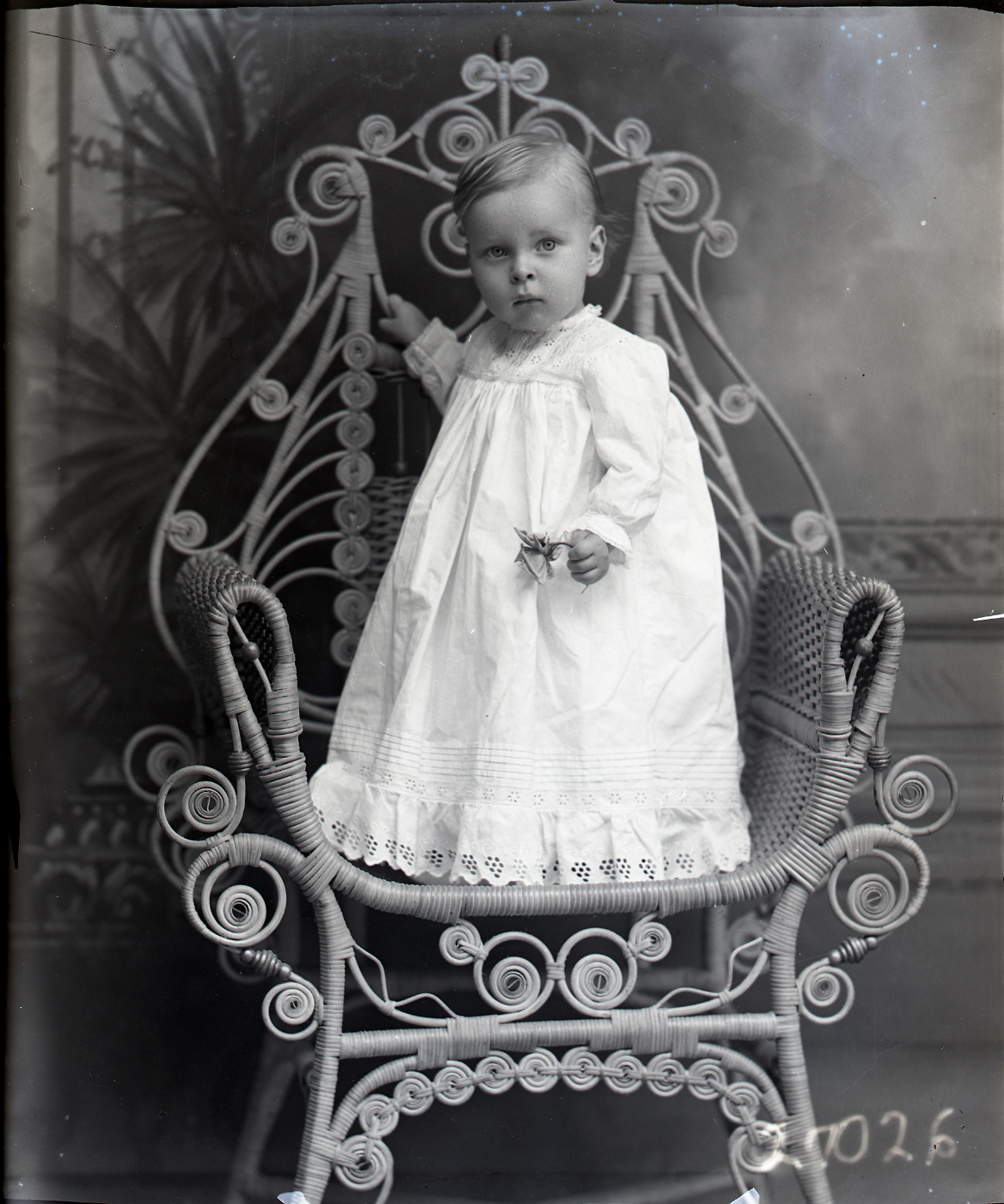 Lester Crabill Miller as a toddler standing on a wicker chair.