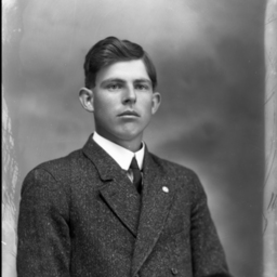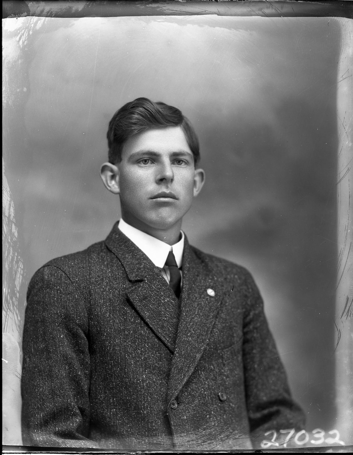 Portrait photograph of an unidentified young man wearing a suit and tie with a pin on the lapel.