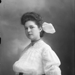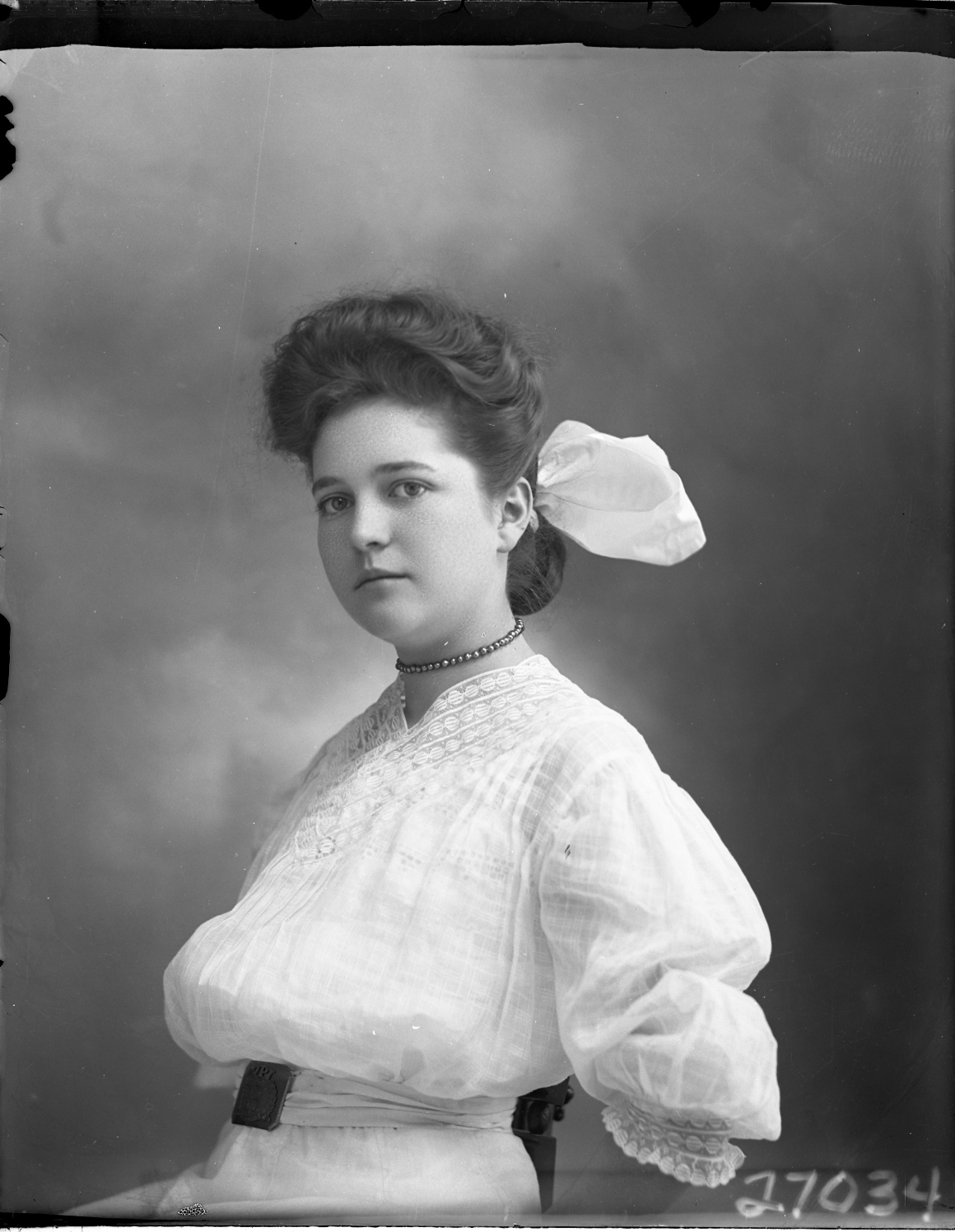 Portrait photograph of an unidentified woman wearing a large bow in her styled hair.