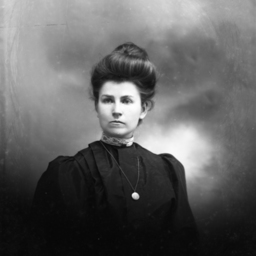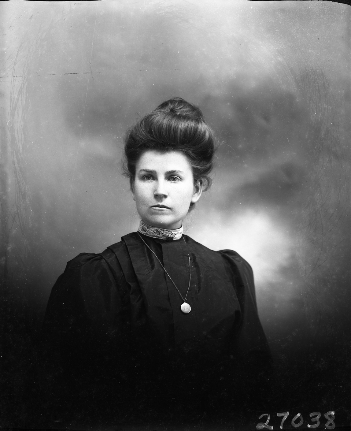 Portrait photograph of an unidentified woman with her hair style up and wearing a locket with her dark dress.