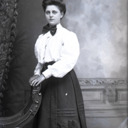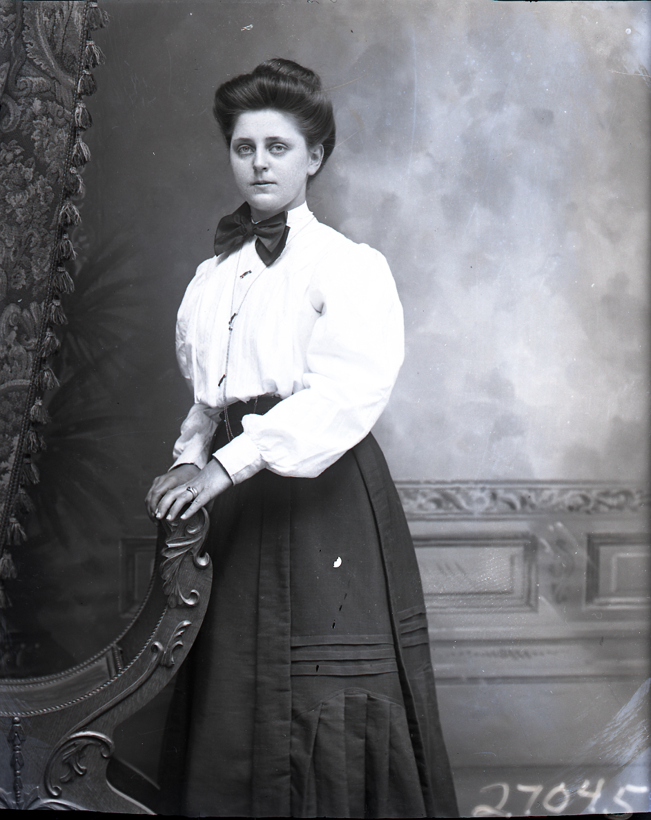 Unidentified woman with her hair pulled up, and wearing a bow at her neck, is standing by a chair.