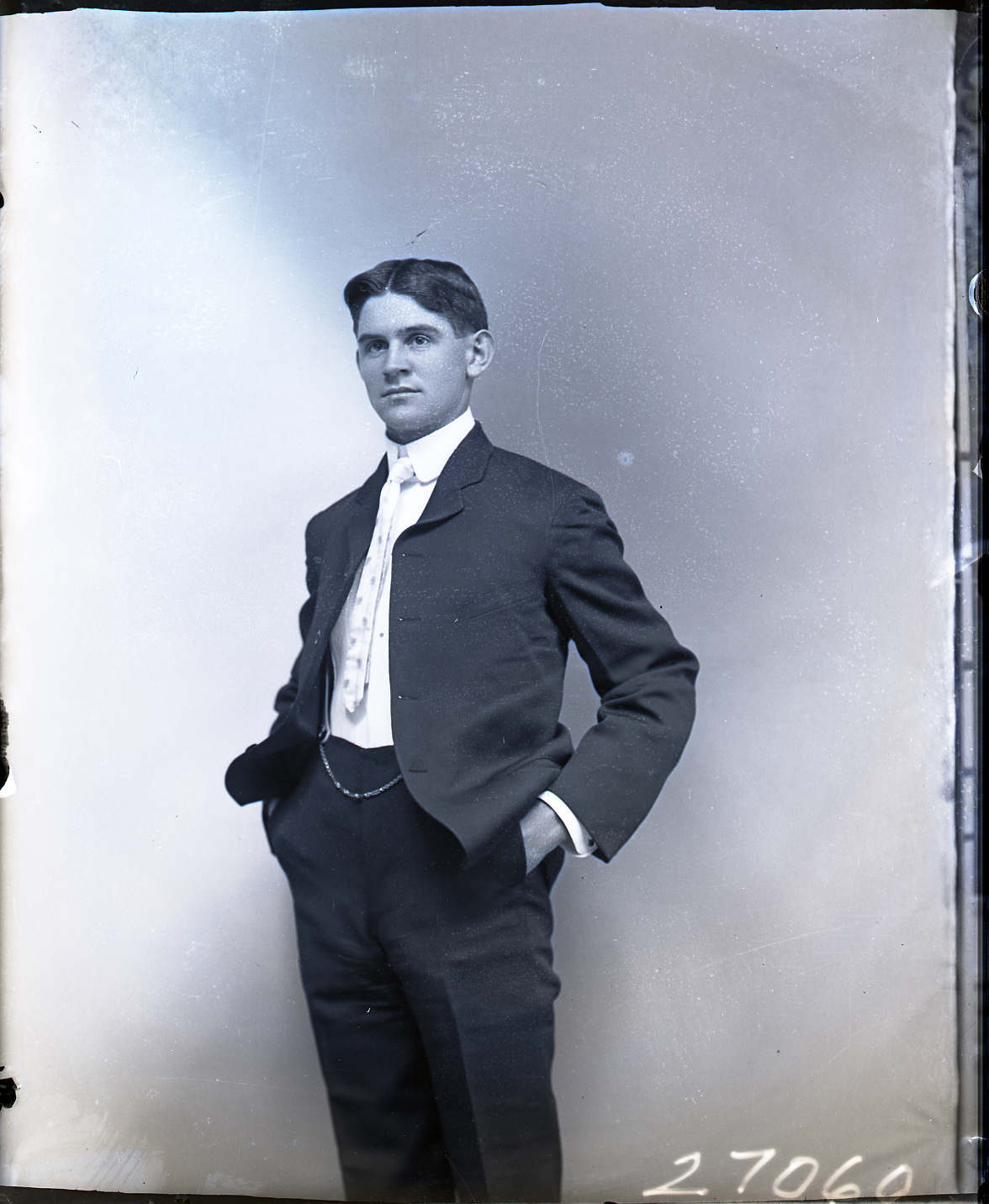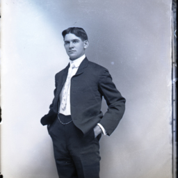 Unidentified young man, wearing a suit and tie with a starched collar, is standing with both hands in his trouser pockets.