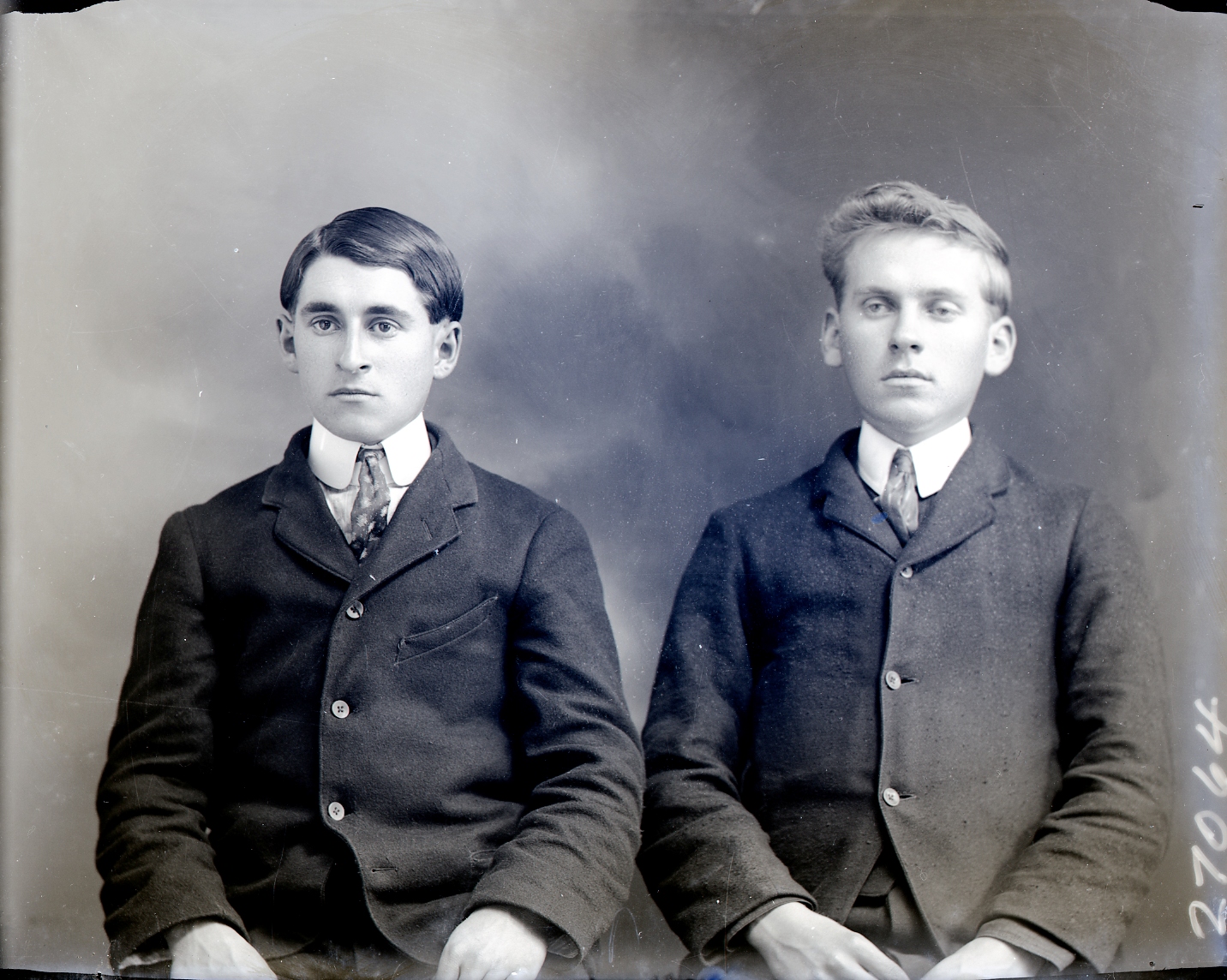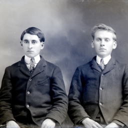 Portrait photograph of two unidentified young men, probably teenaged. Both are wearing suit jackets (buttoned up) and ties with starched collars.