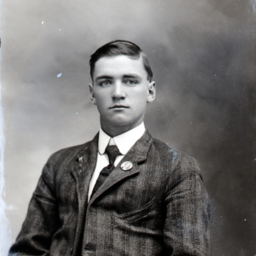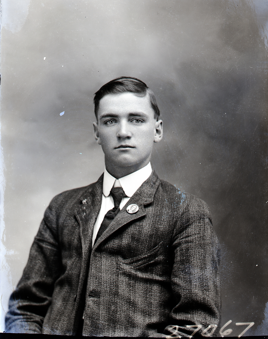 Portrait photograph of an unidentified young man wearing a suit and tie with a starched collar. The pin on his lapel has a man's face on it.