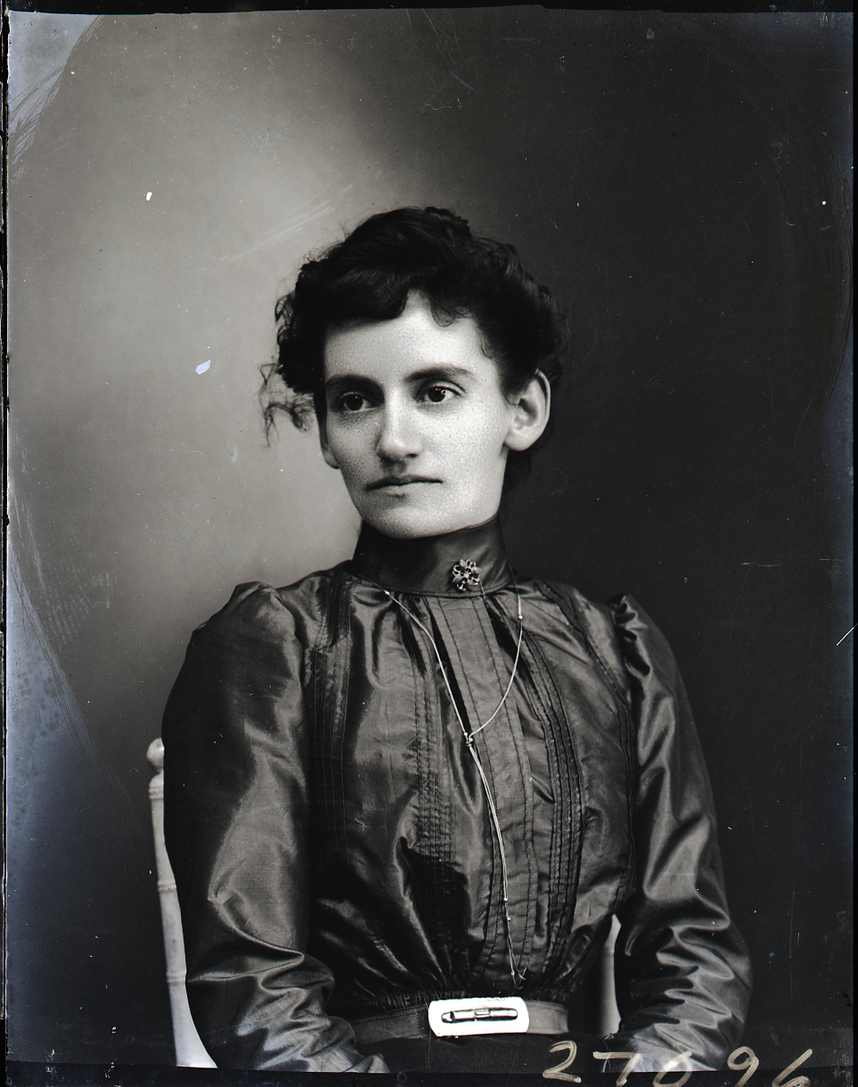 Portrait photograph of an unidentified woman with her hair pulled up and wearing a long-sleeved dress with a pin at the neck.