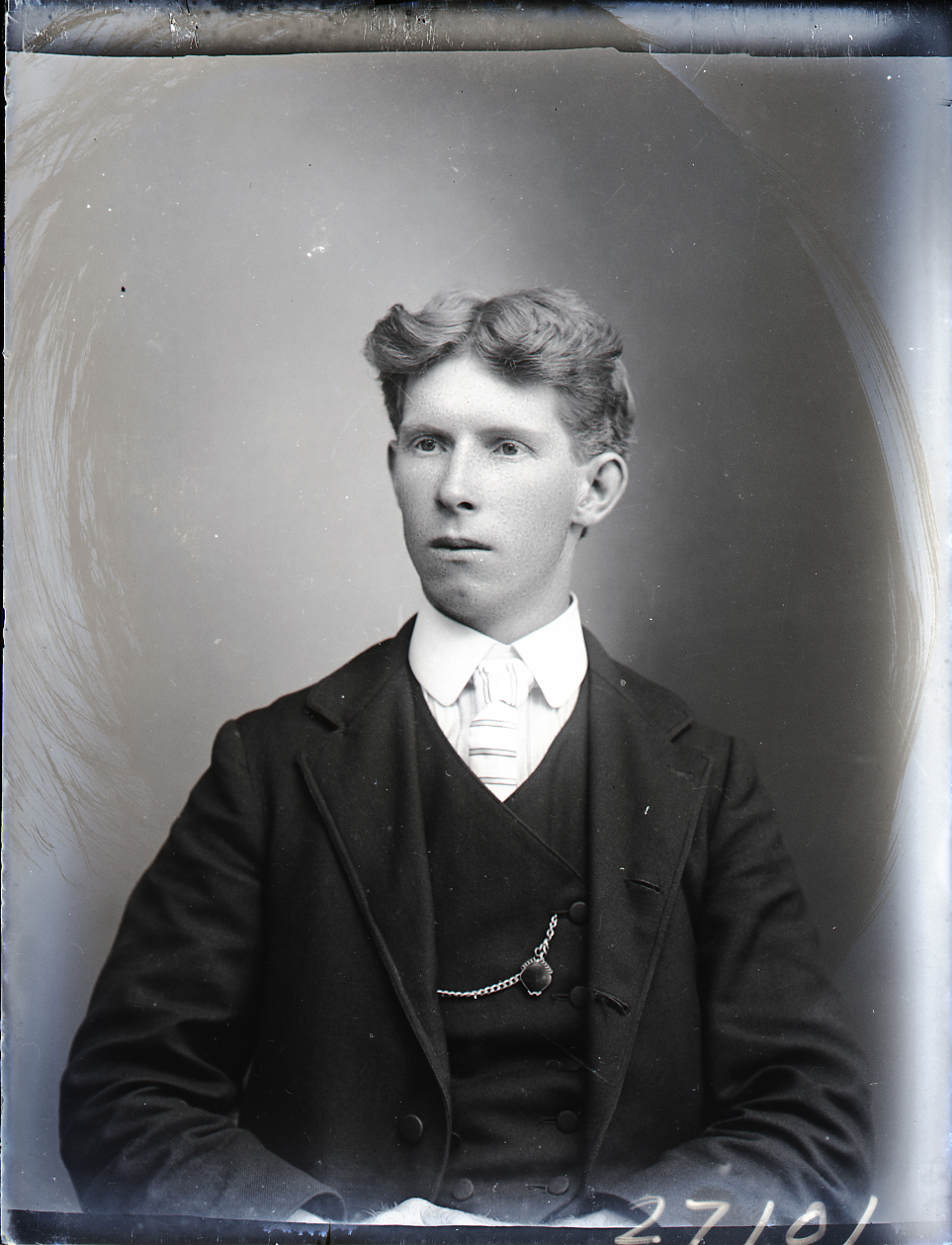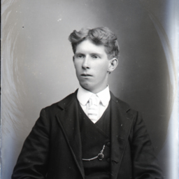 Portrait photograph of an unidentified young man wearing a suit and tie with a starched collar. A chain is visible attached to his vest.