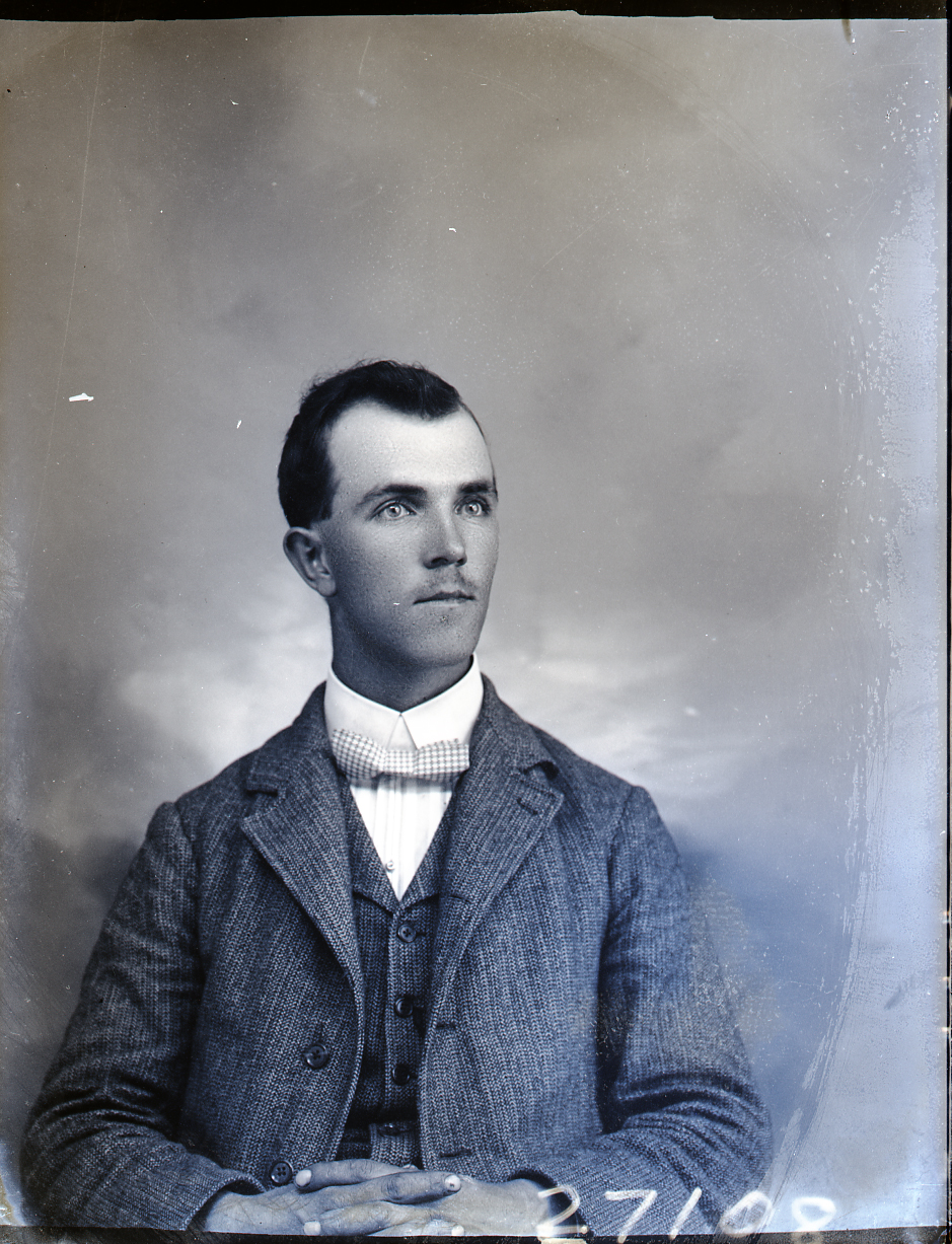 Portrait photograph of an unidentified young man with a hint of a mustache and wearing a suit and checkered bow tie with a starched collar.