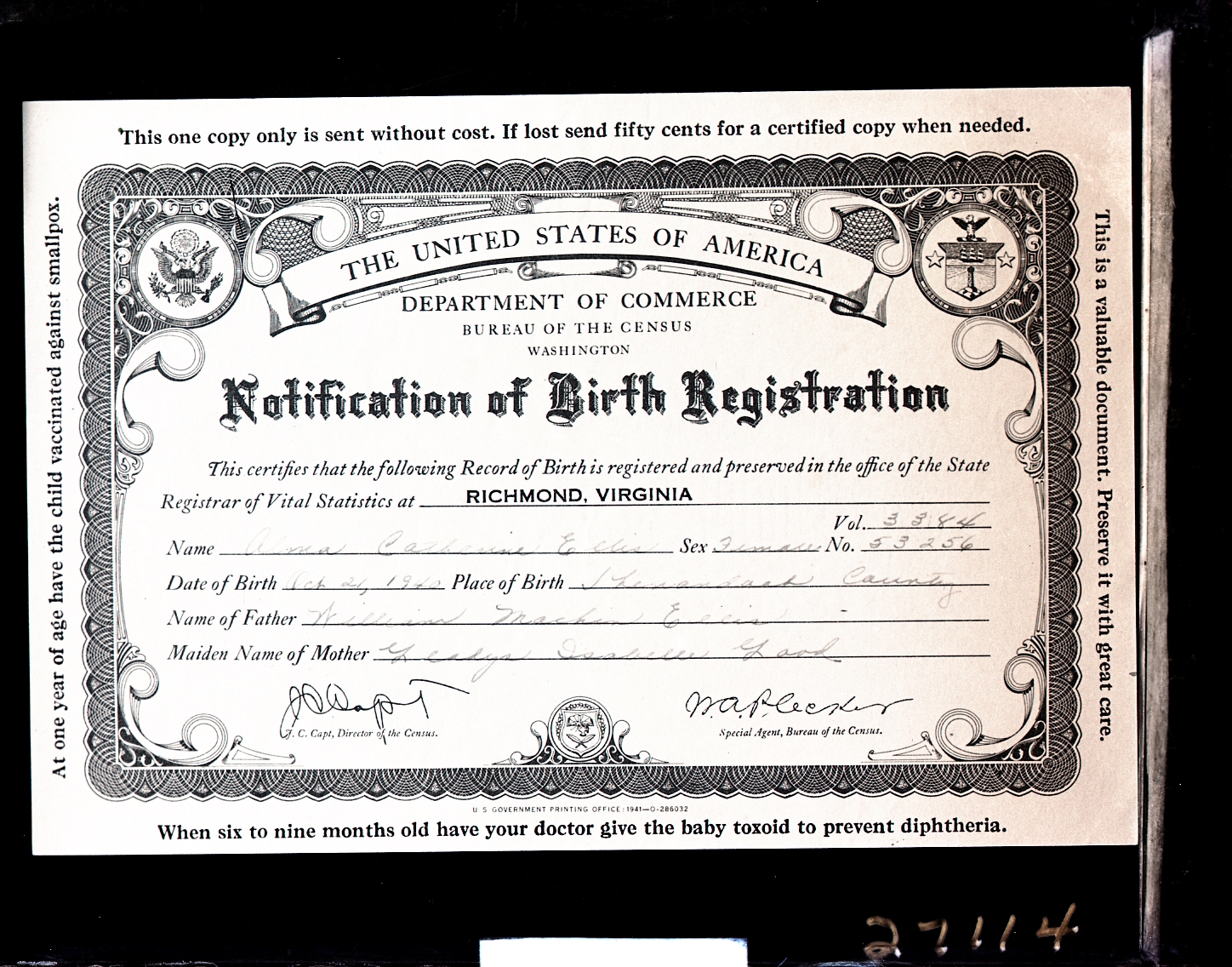 Photograph of the birth registration issued for Alma Catherine Ellis who was born on October 21, 1940, in Shenandoah County.