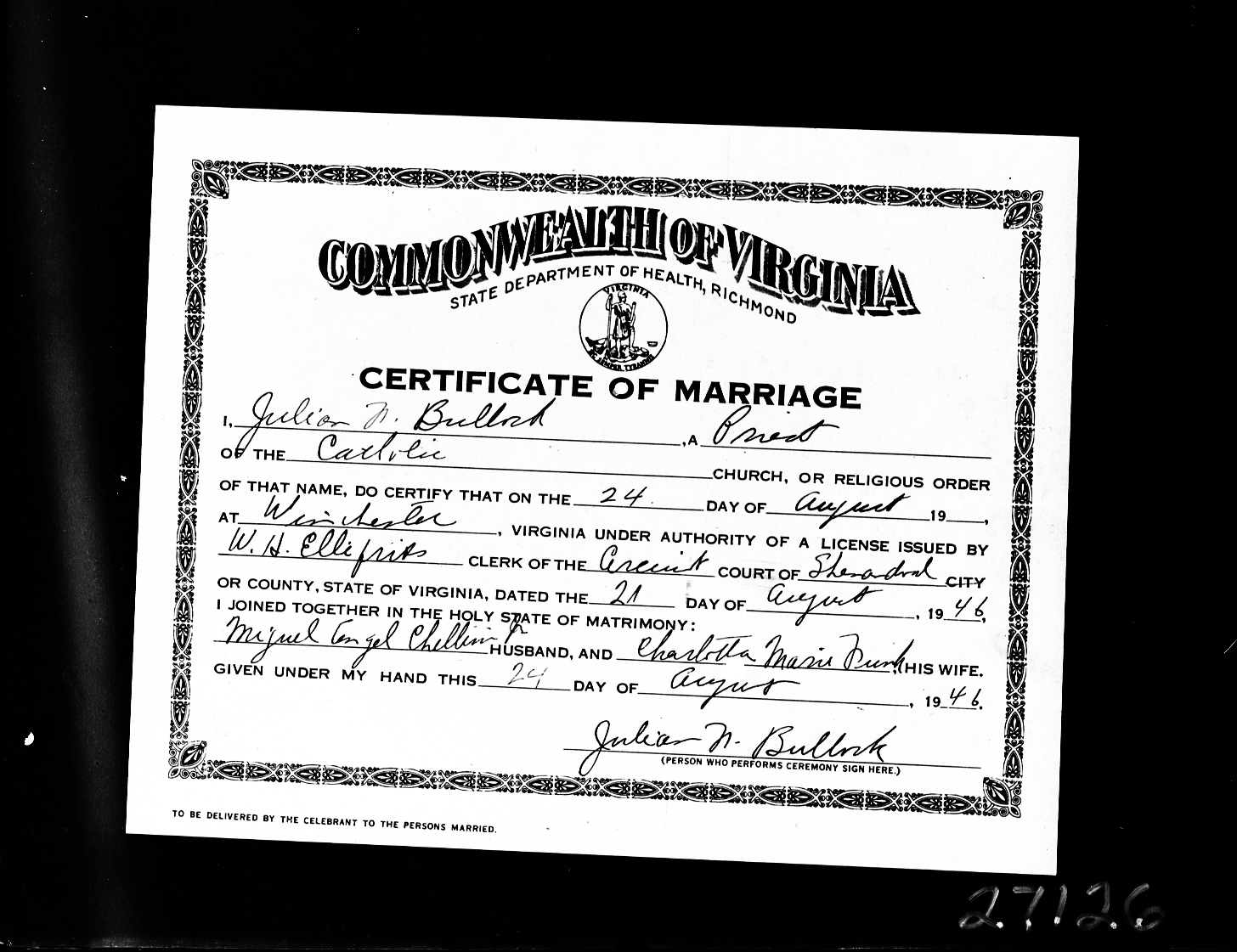Photograph of a marriage certificate attesting that Miguel Angel Chellini, Jr., and Charlotta Marie Funk were married in Winchester, Virginia, on August 24, 1946.