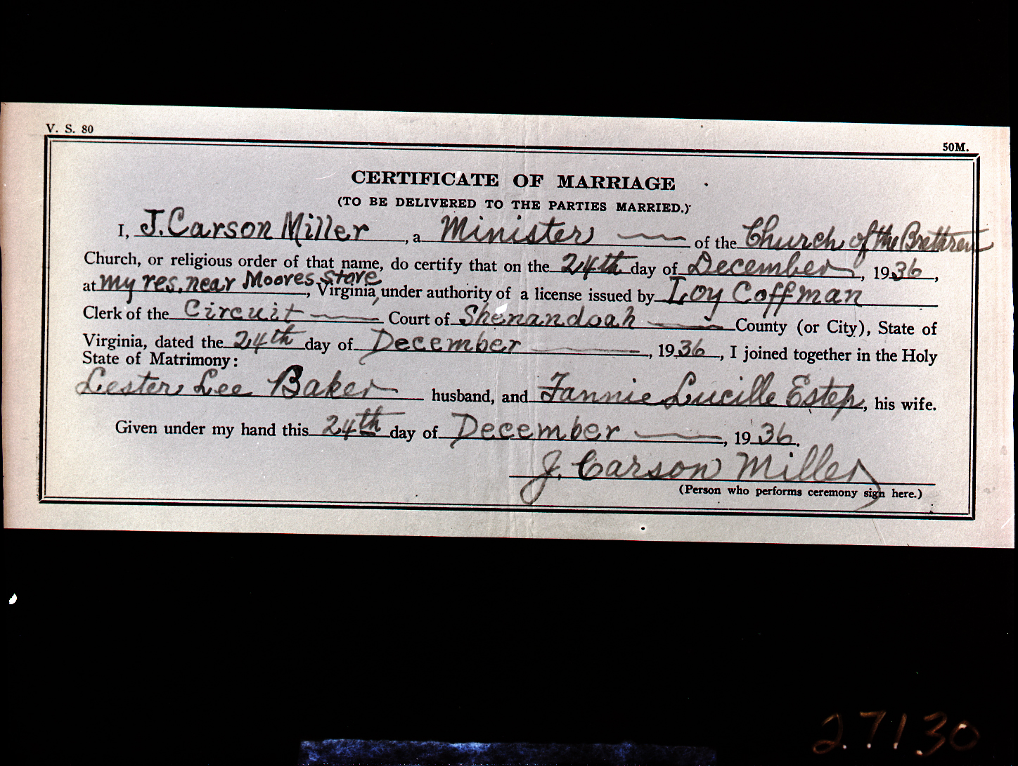 Photograph of a marriage certificate attesting that Lester Lee Baker and Fannie Lucille Estep were married at the minister's residence near Moores Store in Shenandoah County, on December 24, 1936.