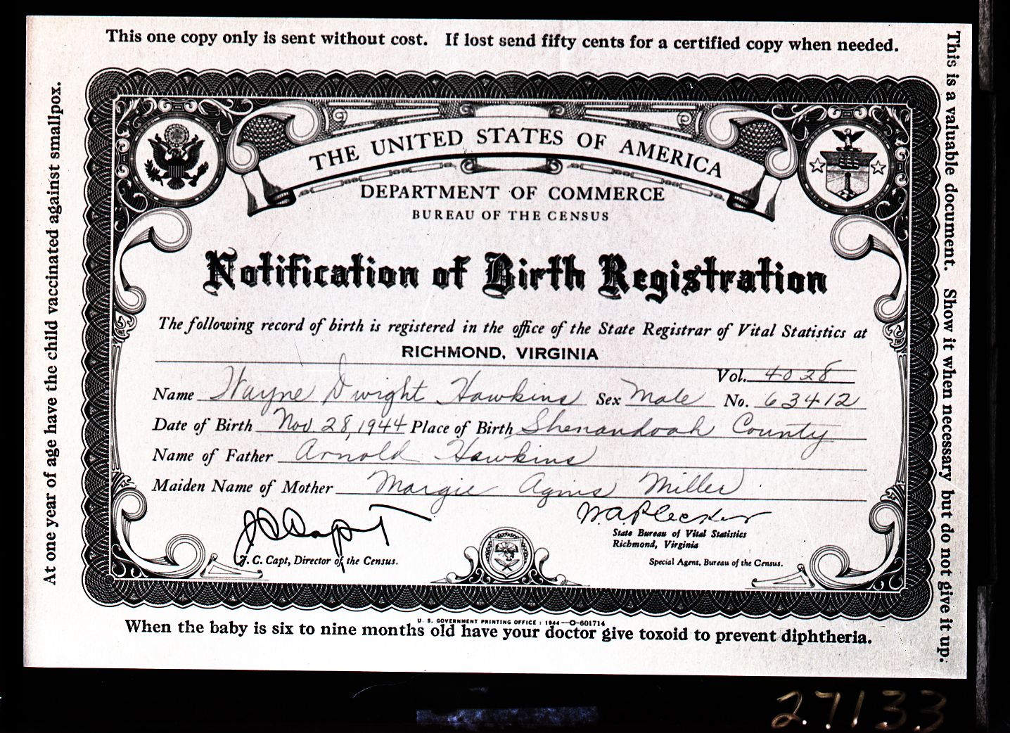 Photograph of the birth registration issued for Wayne Dwight Hawkins who was born on November 28, 1944, in Shenandoah County.