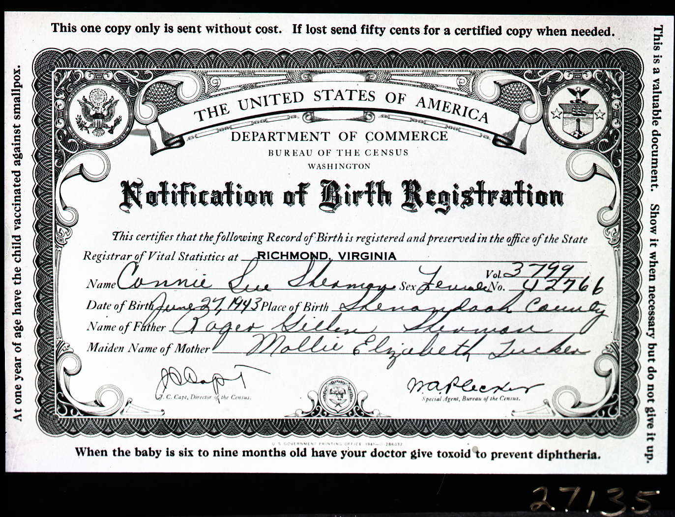 Morrison Studio, “Connie Sue Sherman's Birth Certificate,” Shenandoah County Library Archives, accessed December 5, 2025, https://archives.countylib.org/items/show/56813.