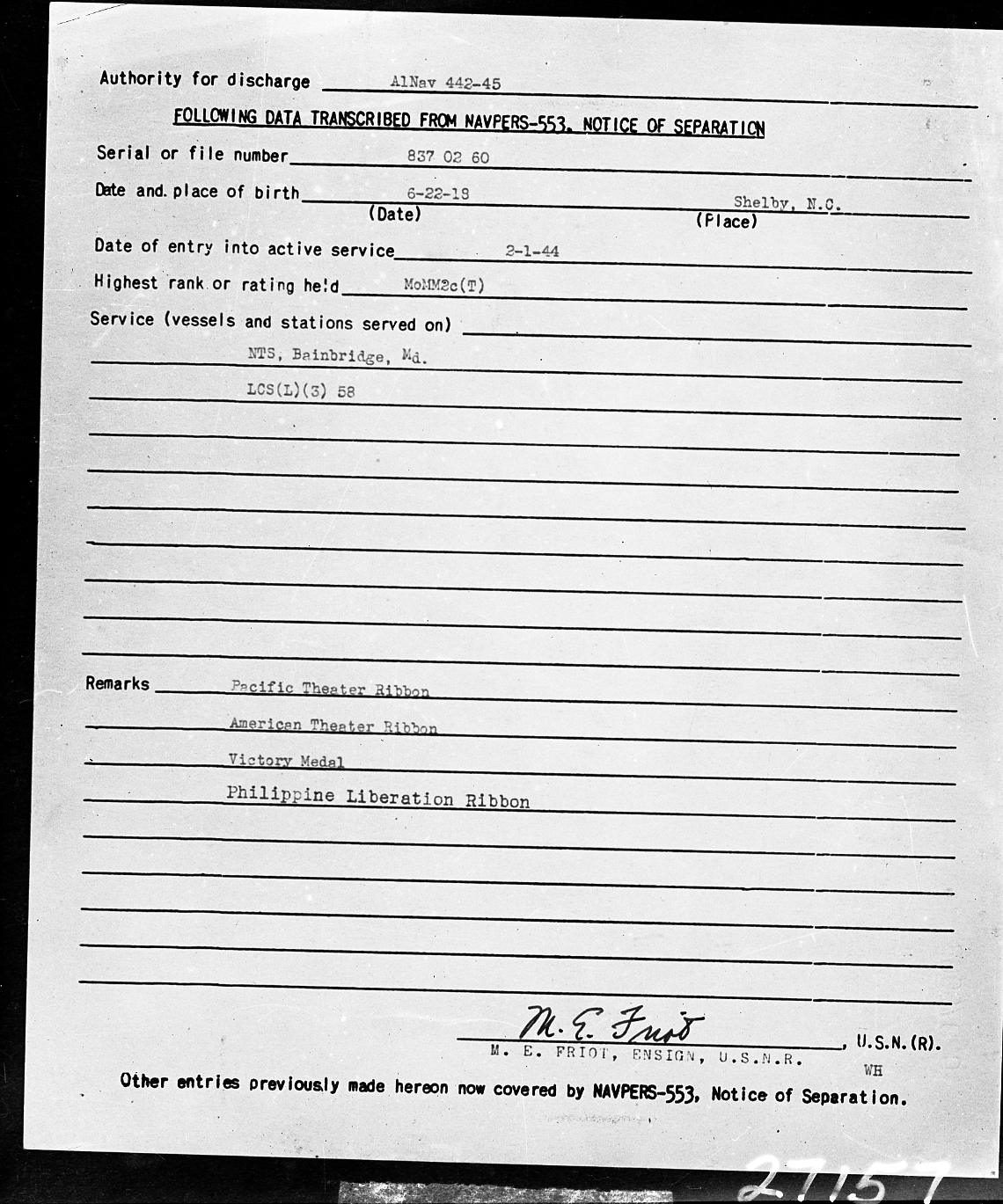 He entered Naval service on February 1, 1944. He served in Bainbridge, Marryland and "LCS(L) (3) 58".