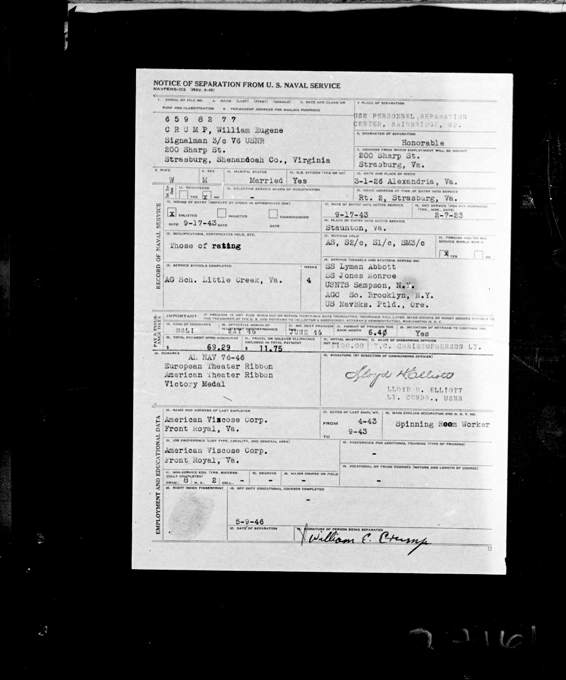Photograph of the form titled, "Notice of the Separation From U.S. Naval Service" signed by William Eugene Crump, in May 1946.