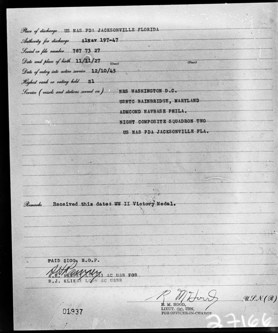 The name, R.M. Hood, Lieutenant (Jg), appears at the bottom of the page, and may be the person who prepared the form.
