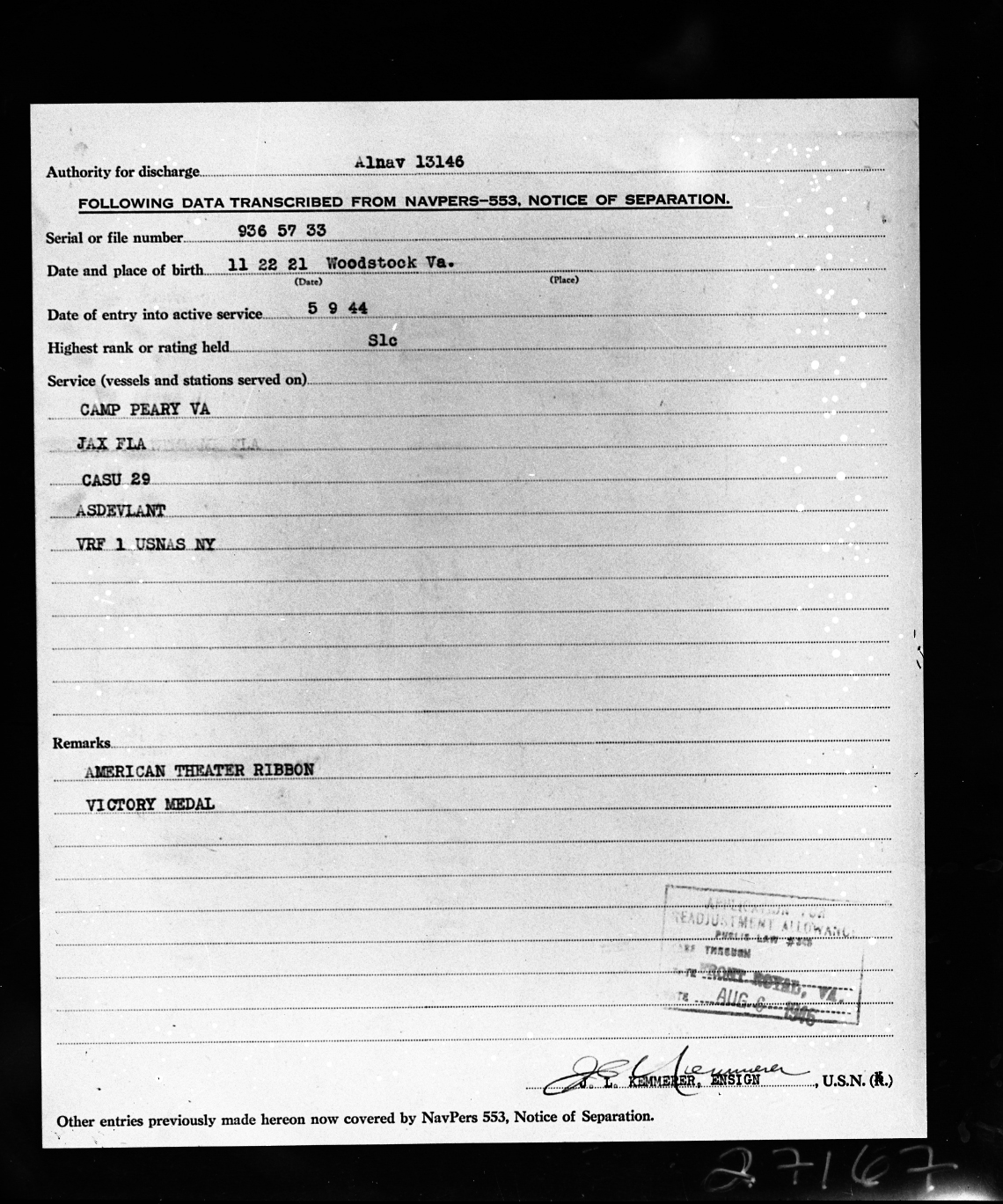 Photograph of a single page from a Notice of Separation packet for an unnamed "S1c" who was born in Woodstock, Virginia, on November 22, 1921.