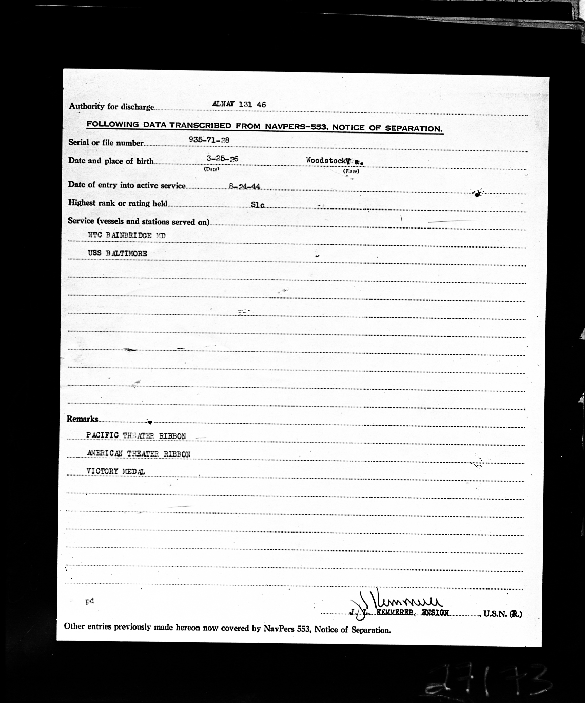 The name, J.L. Kemmerer, Ensign, appears at the bottom of the page, and may be the person who prepared the form.
