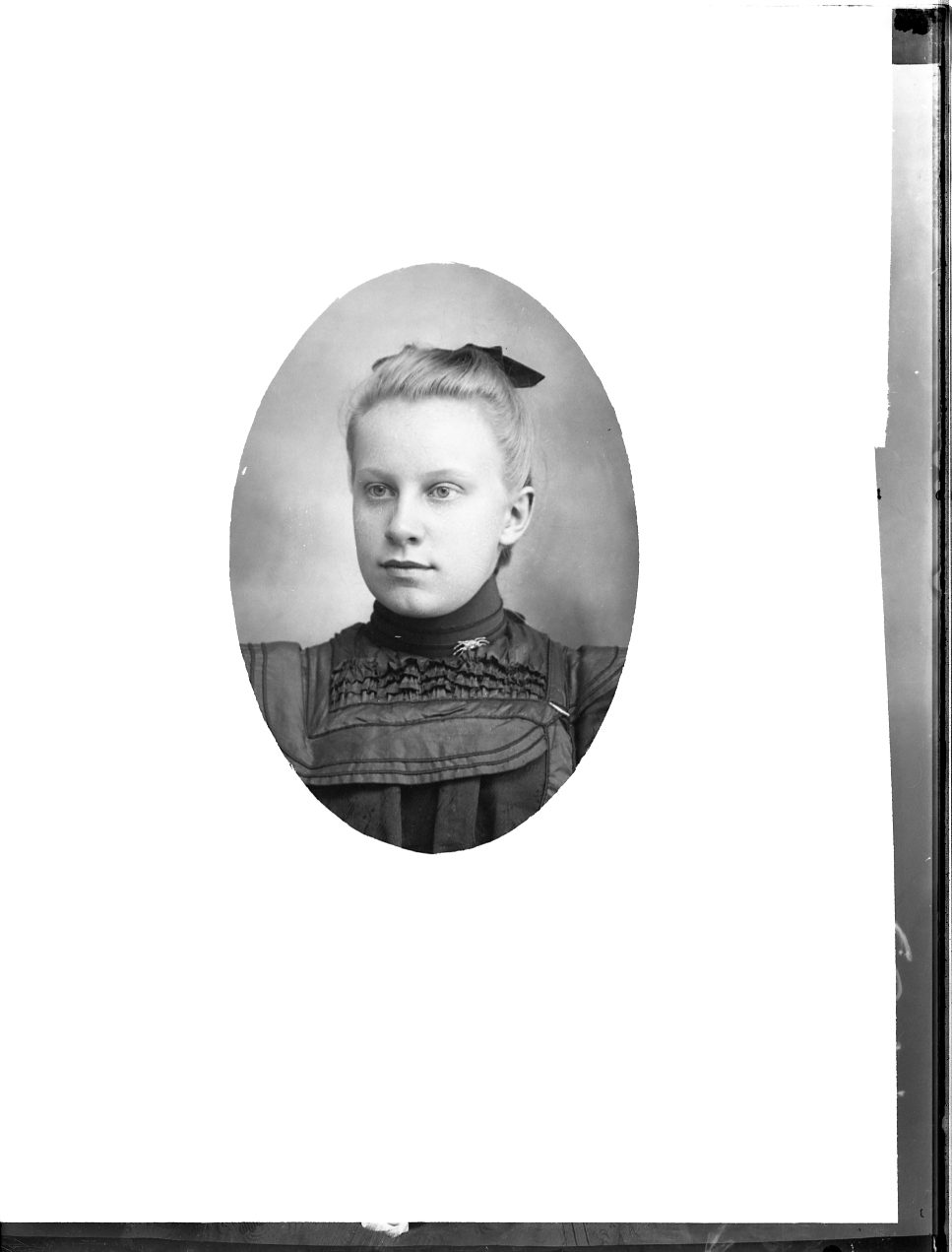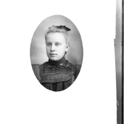 Photo of an oval-framed portrait photograph of an unidentified woman wearing a bow on her head.