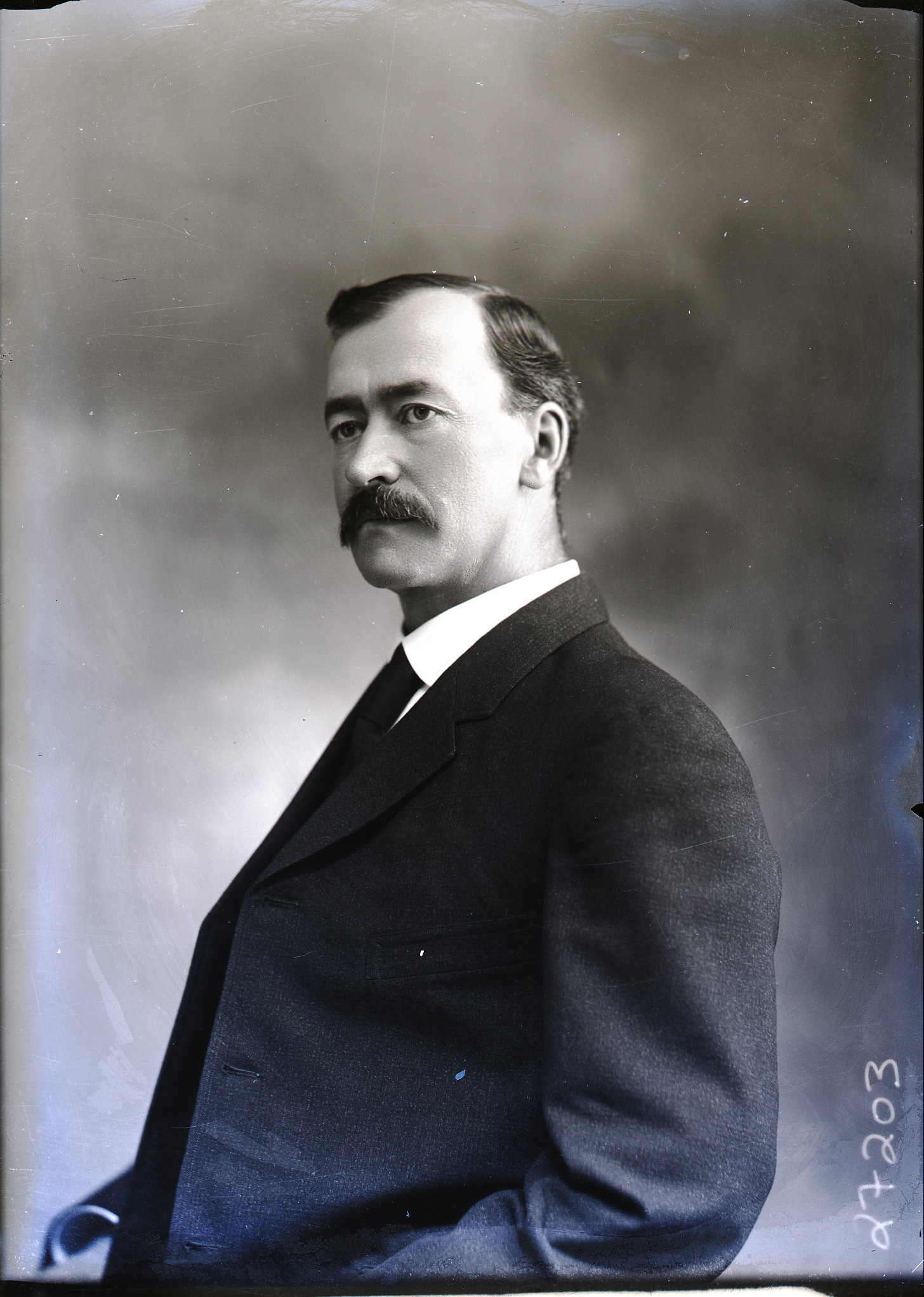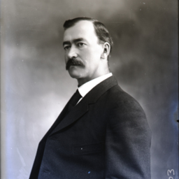 Portrait photograph of an unidentified man with a mustache and wearing a suit and tie.