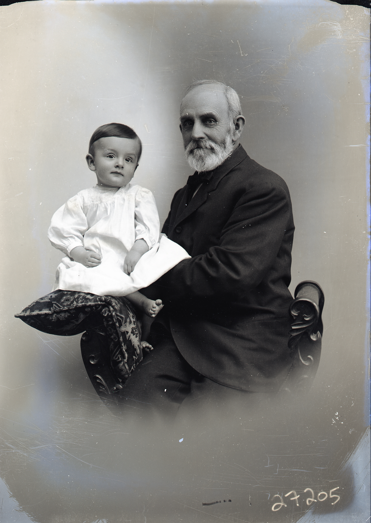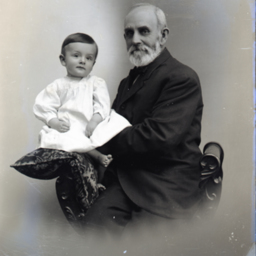 Unidentified older man with a mustache and beard is seated and holding an unidentified barefoot young child on the arm of the chair.