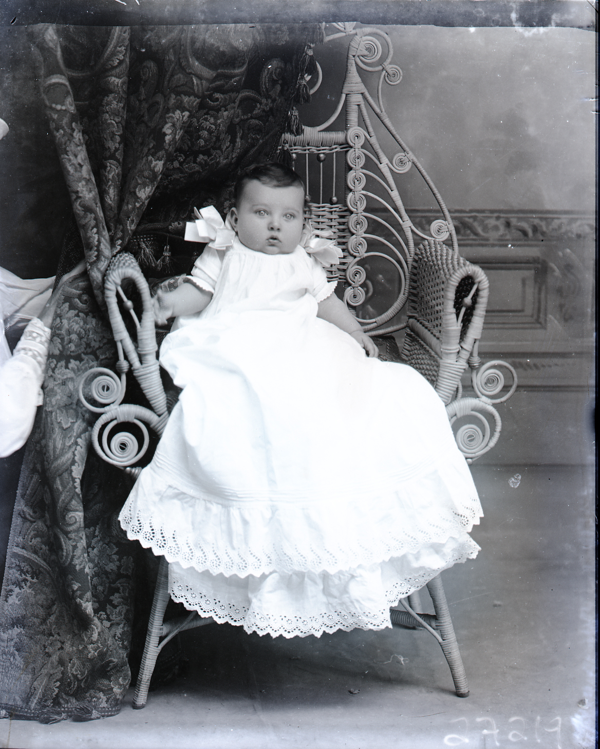 Unidentified baby in a long white gown is seated on a wicker chair.