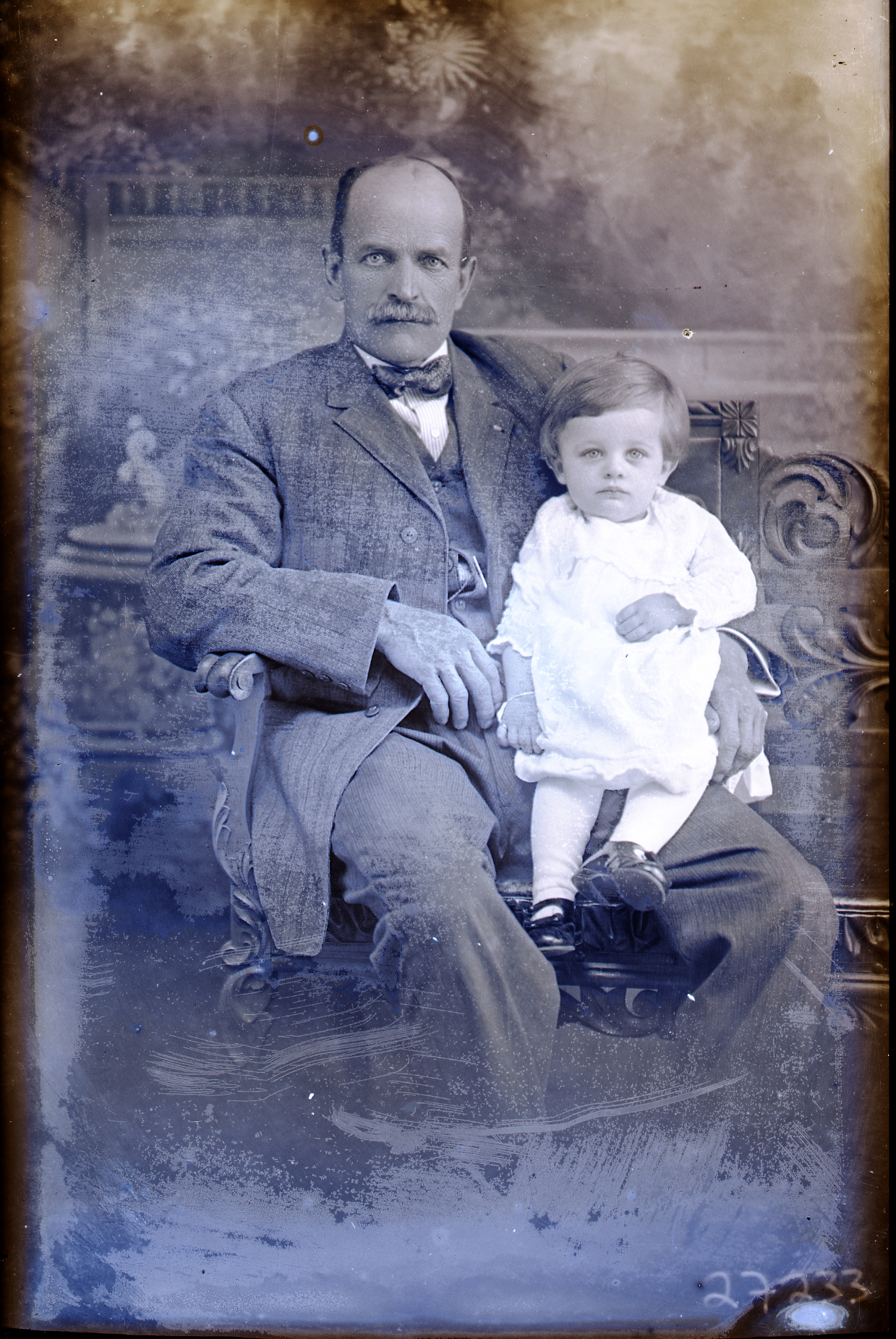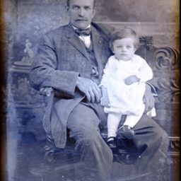 Unidentified man with a mustache and wearing a bow tie, is seated on a bench. An unidentified young child is on his lap.
