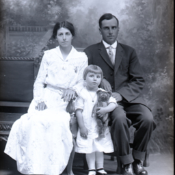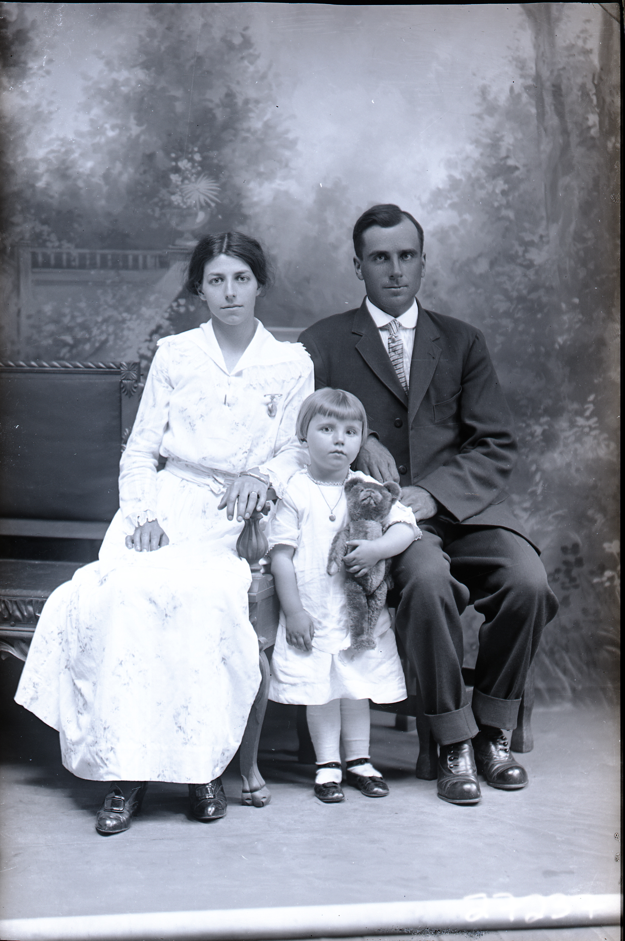 Unidentified man in a striped tie is seated beside an unidentified woman with her hair pulled back. An unidentified girl with short hair and bangs is standing between them and holding a teddy bear.
