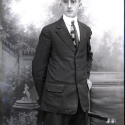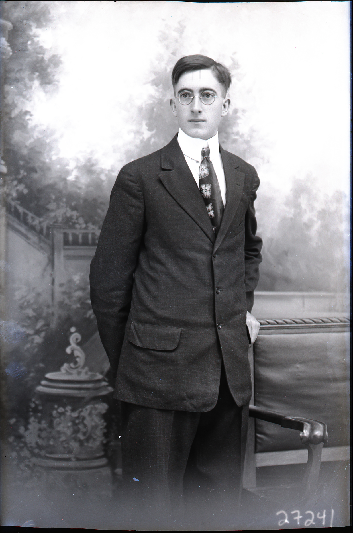 Unidentified young man in round glasses, and wearing a suit and patterned tie with a starched collar ,is standing by a bench with both hands behind his back.