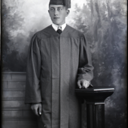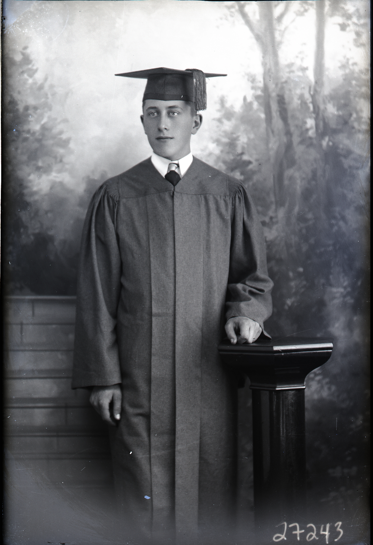 Unidentified young man is standing by a studio prop and wearing a graduation cap and gown.